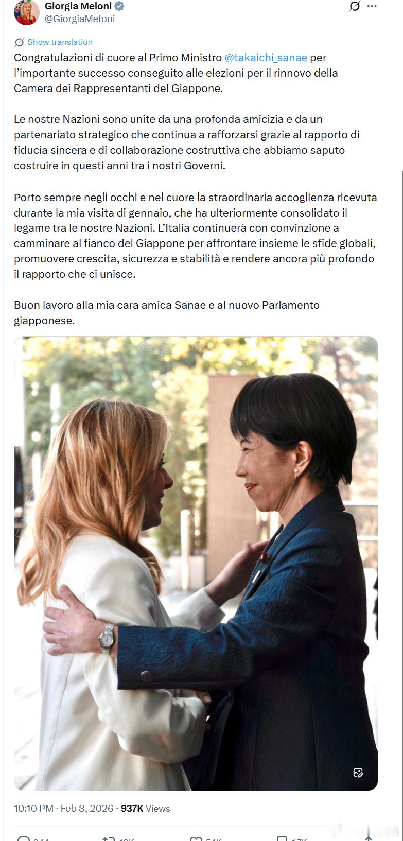 我始终铭记今年一月访问期间受到的热情接待,这进一步巩固了两国间的联系。意大利将继续坚定地与日本并肩同行,共同应对全球挑战,推动增长、安全与稳定,让我们之间的关系更加深厚。