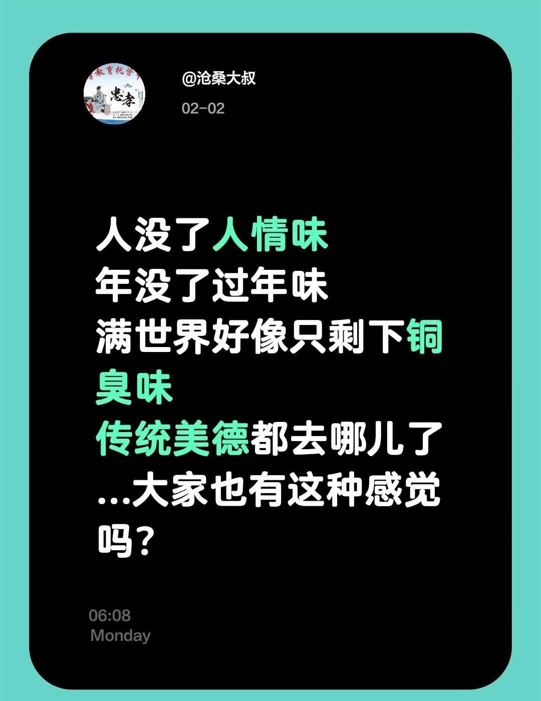 人没了人情味年没了过年味满世界好像只剩下铜臭味传统美德都去哪儿了...大家也有这