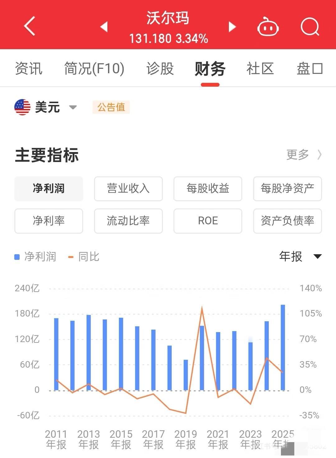 沃尔玛,十年不增长,市盈率45? 越来越看不懂奇葩的美股了 沃尔玛, 2013年利润177亿, 2025年利润201亿, 12年时间,利润才增长13%。 平均每年才增长1%,远远跑输通胀。 但就这个玩意,可以有40多倍的市盈率。 越来越无法理解那些资金的脑回路了。