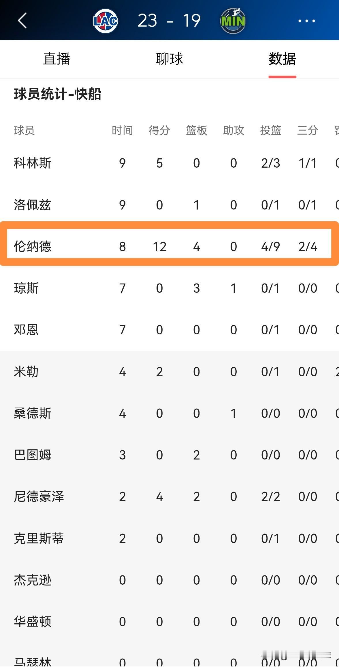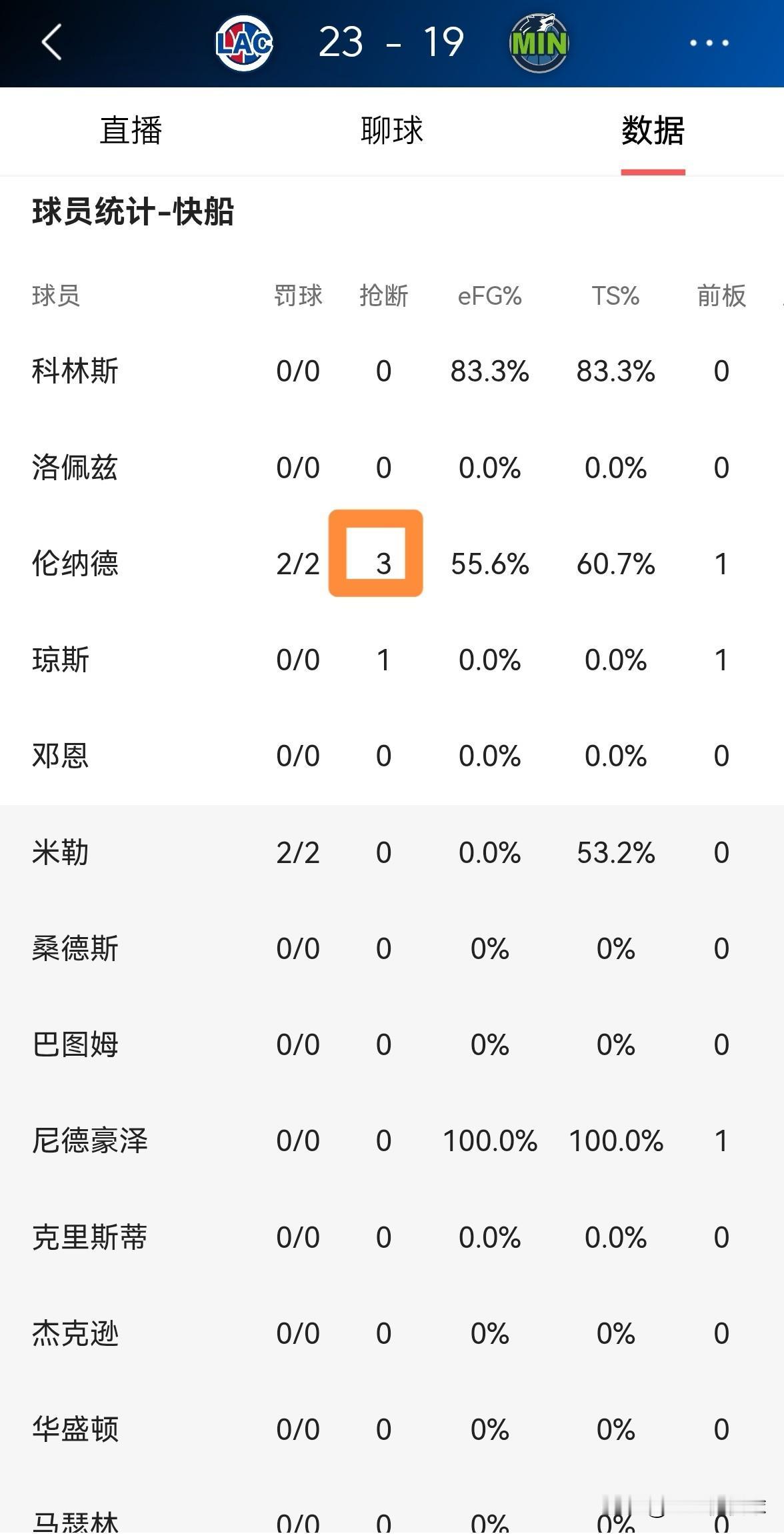 快船超级球星伦纳德真是攻防一肩挑!在今天快船客场挑战森林狼的比赛中,目前双方的第一节比赛已经结束,快船以23:19领先对手4分。值得注意的是,在第一节比赛中,伦纳德就火力全开,他在攻防两端都打出了非常耀眼的表现。 在首节比赛中,伦纳德首发出战8分钟,投篮9中4,其中三分球4中2、罚球2中2砍下12分4篮板3抢断,他的场上正负值为+5。