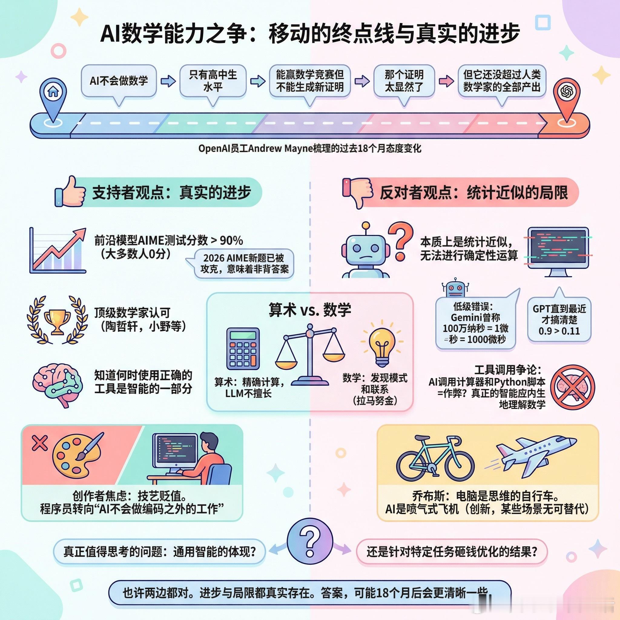 支持者指出,前沿模型在AIME测试上已经能拿到90%以上的分数,而大多数人连一道题都答不出来。更关键的是,2026年刚发布的AIME新题也被攻克了,这意味着不是靠背答案。陶哲轩、小野等顶级数学家都在认可AI的数学贡献,而很多数学研究生还停留在“AI不会做数学”的认知里。