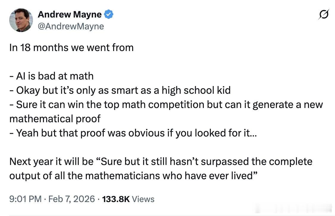 OpenAI员工Andrew Mayne发了一条推文,梳理了过去18个月里人们对AI数学能力的态度变化:从“AI不会做数学”,到“只有高中生水平”,到“能赢数学竞赛但不能生成新证明”,再到“那个证明太显然了”。他预测下一个说法会是“但它还没超过人类数学家的全部产出”。