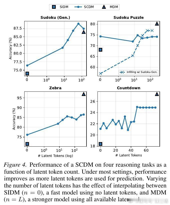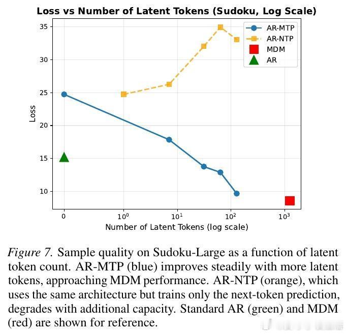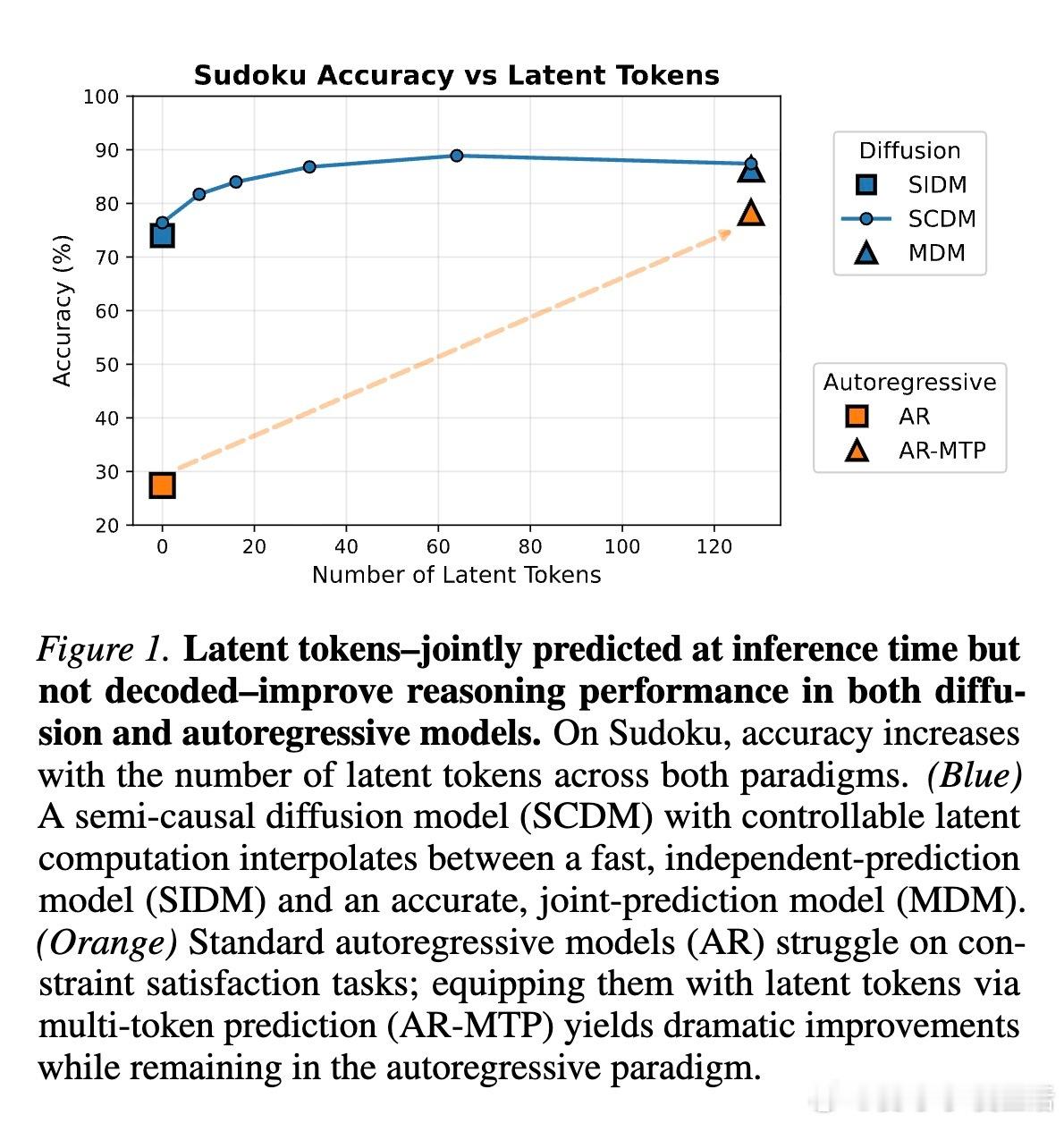 通过多代币预测(Multi-Token Prediction)的辅助目标进行训练,自回归模型也能在预测当前代币时利用未来的潜空间进行思考。结果令人振奋:加入潜代币后的自回归模型,在数独和逻辑谜题上的表现大幅超越了标准模型,甚至在相同计算量下优于扩散模型。