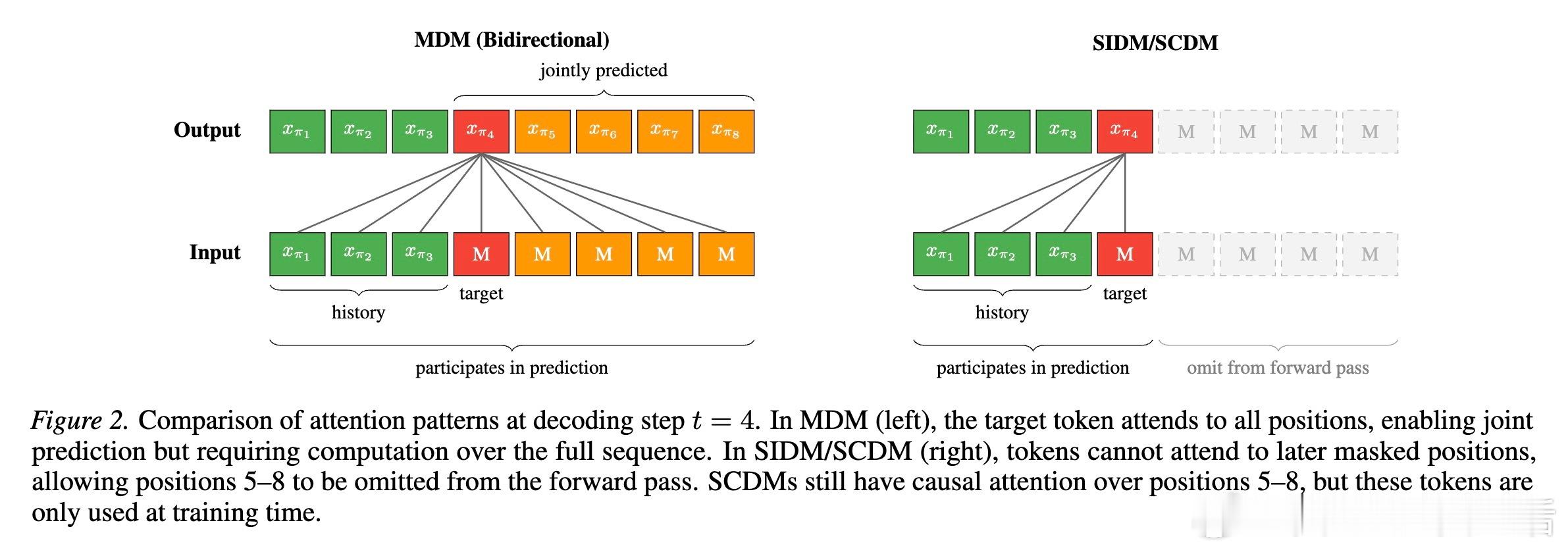 在传统的掩码扩散模型中,生成过程是从全掩码序列开始,逐步揭开代币。虽然每一步我们只选择解码一个代币,但模型在计算时实际上是在对所有未知的掩码位置进行联合预测。