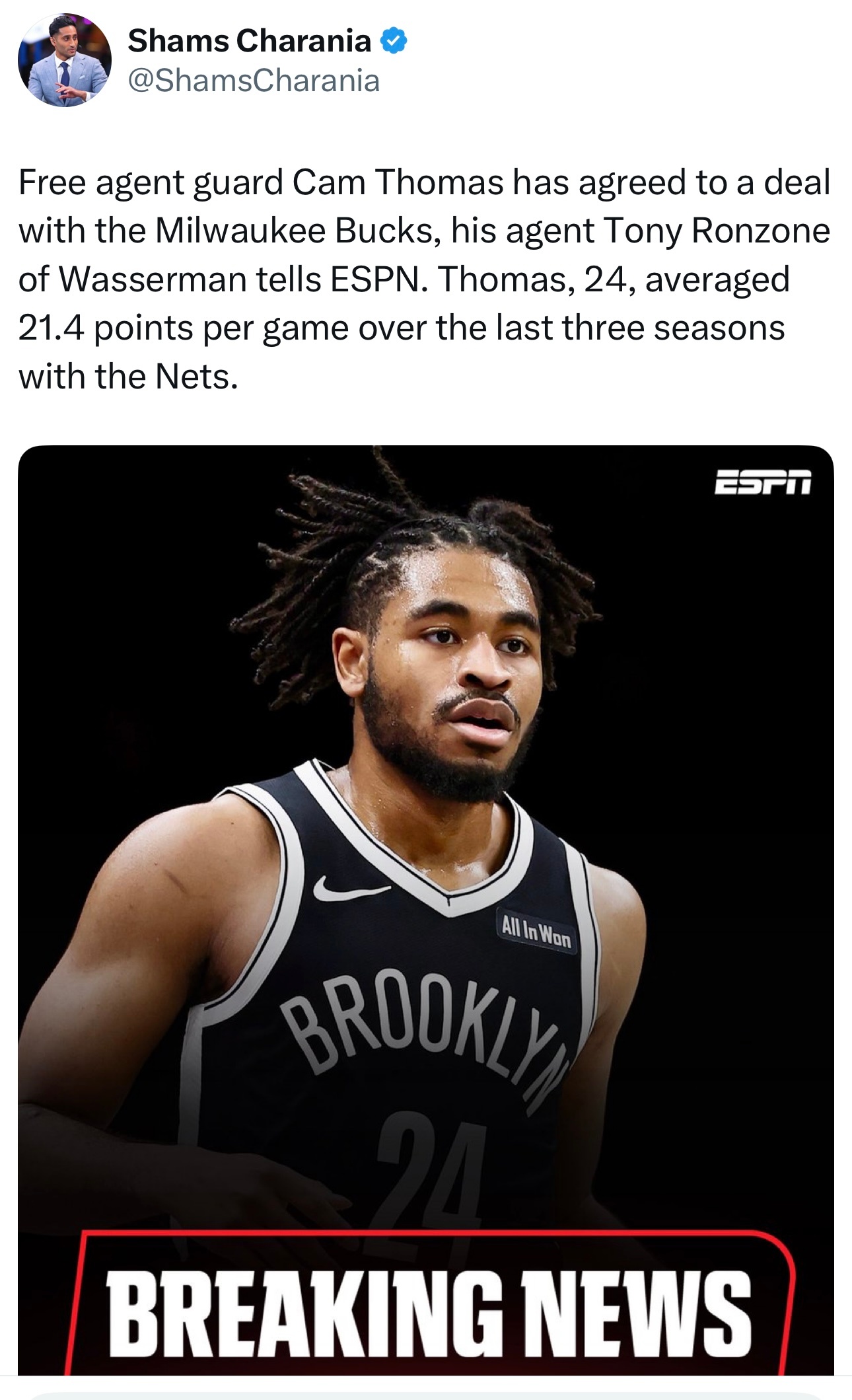 Shams:自由球员卡姆·托马斯加盟雄鹿队。