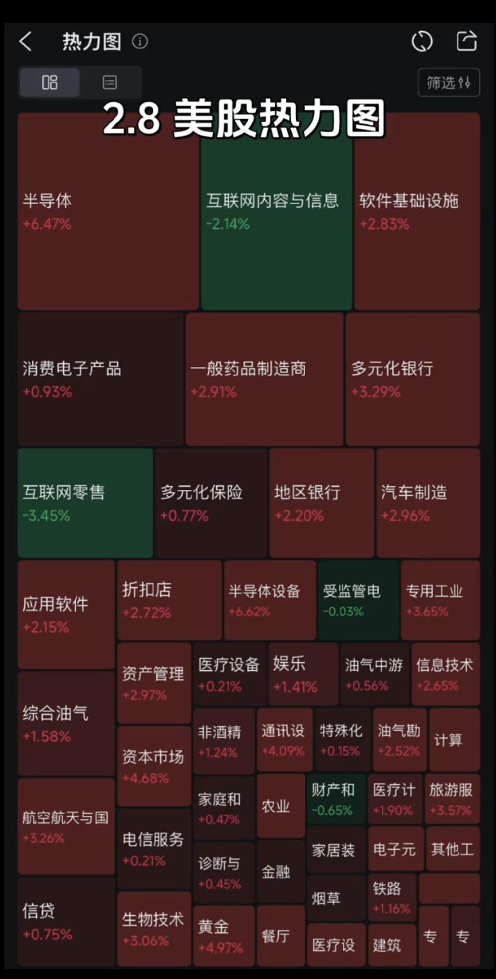 2.9周一 盘前 美股涨跌幅:热力图! 周五晚间美股各大板块对应涨跌幅热力图!咱们的市场还是需要参照美股的走势 仅供参考: