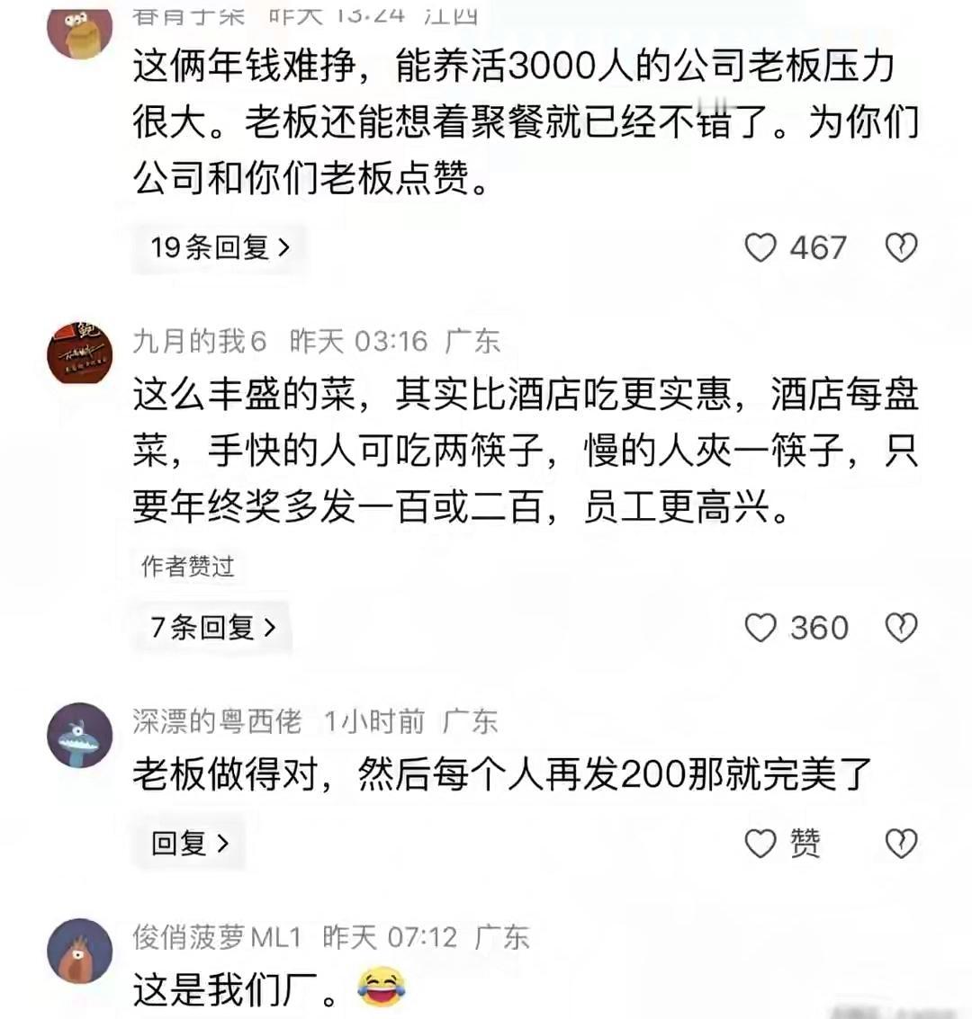 太寒碜了!中山一3000多人电子厂举办年会,让员工吃自助餐引争议 2月6号,中山一家3000人的电子厂年会没租酒店场地,没请明星表演,也没设置抽奖环节,就在公司食堂办自助,菜品有大虾、炸鸡和瑞士卷,分量给得很足,却被网友吐槽“太寒酸,不像年会”。但了解背后的情况后,我觉得这种务实的做法,更值得职场人认可。 其实争议的核心,从来不是饭菜好不好,而是大家对“年会意义”的理解不同。有人觉得年会就得有排场,才算有仪式感;可对很多制造业员工来说,真正的安全感,来自日常的保障。据老员工说,这家厂去年没裁过一个人,工资按时发放,五险一金从不拖欠,年底还有双薪,甚至不用上夜班。这些实实在在的福利,比一顿豪华晚宴更能让人安心。 从企业角度算笔账也很清楚,3000人去外面办年会,场地、交通、餐食损耗加起来,成本是食堂自办的两三倍。把这笔钱省下来,投入到员工福利和生产运营中,反而更划算。粤港一带的老厂向来不讲究排场,“饭可以简单吃,活不能白干”的理念,其实很贴合当下的职场现状。 现在的打工人越来越清醒,比起镜头前的光鲜,更在乎工资能不能准时到账、下班能不能赶上末班车。食堂的炸鸡凉了可以再热,但考勤表上的打卡时间、实实在在的收入,才是最改不了的根本。这场没有排场的年会,看似“寒酸”,实则是企业把钱花在了刀刃上。 年会的形式从来不是重点,员工的切身利益才是。不搞形式主义,踏踏实实做好日常保障,这样的企业,反而更能赢得人心。