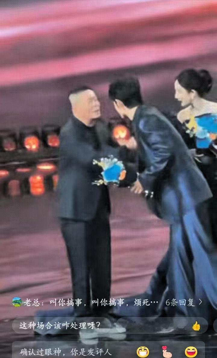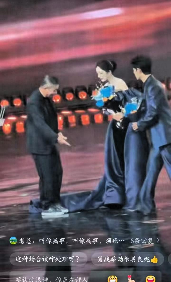 注意看,wb老总上台后,杨幂、肖战一开始并没动作,站的笔直没有动,直到老总脚碰到杨幂的裙摆,杨幂才马上做出“请往中间”的手势,肖战也随即走到两人中间,看似一起邀请老总,可老总却一直扬手示意杨幂往边上挪,短短几秒,尽显社交场上的分寸感。 其实这并非什么“冲突名场面”,更像是一场高情商的临场应对。杨幂的反应很真实,被碰到裙子后没有失态,而是用“邀请”的动作化解尴尬,既表达了谦恭,也试图避免直接被挪位的窘迫,这是成年人最本能的体面维护。 而肖战的补位,更不是刻意抢镜,而是恰到好处的缓冲,他站在中间,让“调整站位”变得更自然,既帮杨幂解了围,也给老总留出了主导空间,这份细腻的观察力,确实难得。 老总的肢体语言虽然显得强势,但大概率也是想快速调整到合适站位,只是动作稍显直接。反观两位艺人的应对,没有争执,没有冷场,都在尽力维护现场秩序,这其实就是娱乐圈社交的常态——看似光鲜的舞台背后,藏着无数细微的分寸拿捏。 比起红毯上的争奇斗艳,这种临场的体面应对,更能看出一个人的素养。没有夸张的戏码,只有成年人之间的互相成全与自我解围,这才是真实的社交现场。