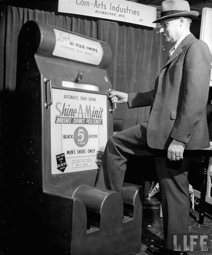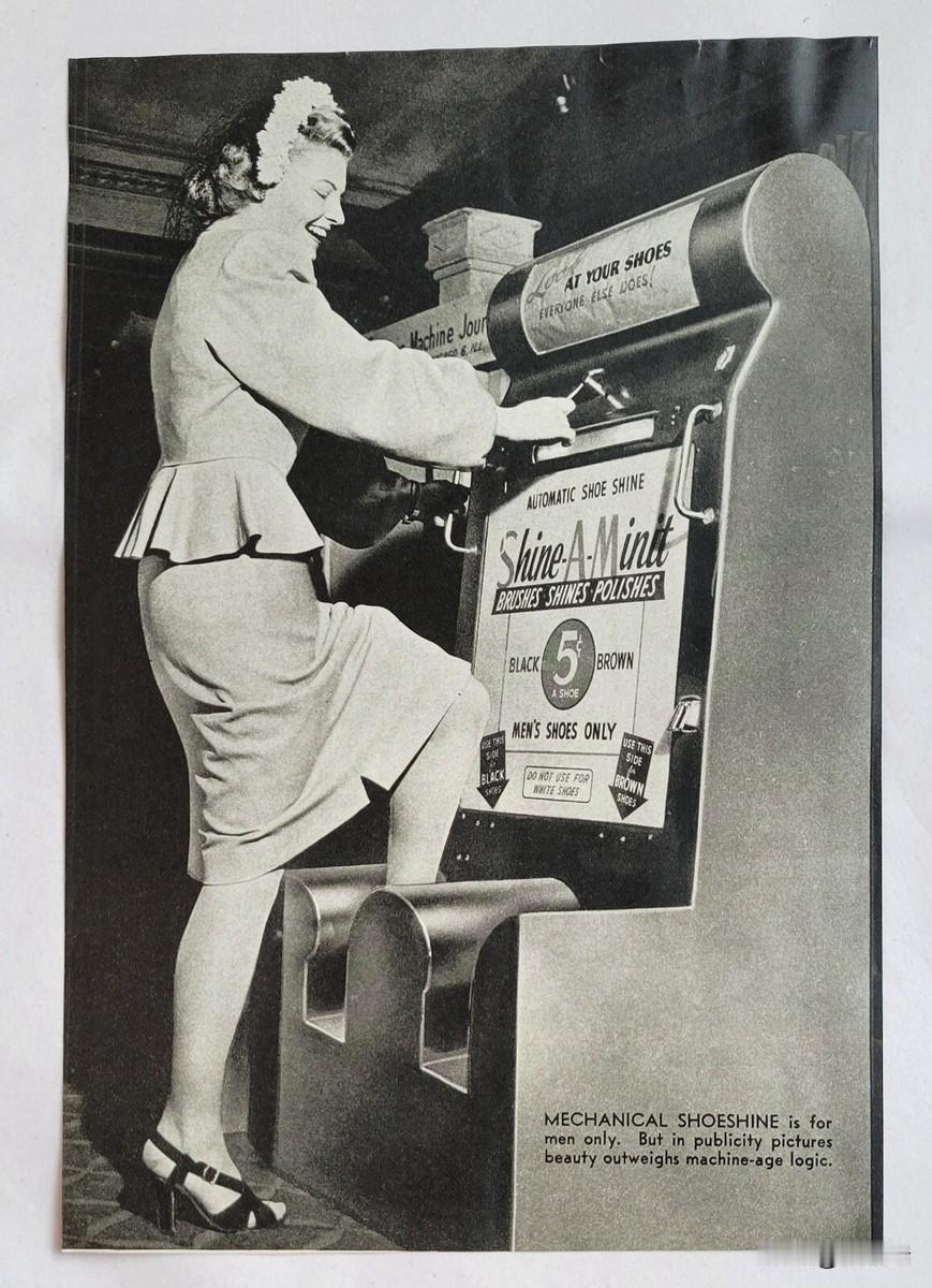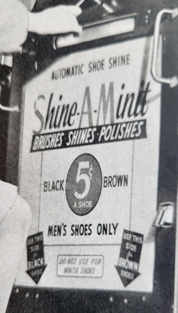 这是一台 1947 年左右的投币式自动擦鞋机,品牌名为 Shine-A-Minit。 这种机器由密尔沃基的 Coin-Arts Industries 制造,通常出现在机场、酒店和火车站等场所。 机器主要特点 服务费用:每只鞋收费 5 美分。 功能:具备刷鞋、上油和抛光功能,适用于黑色或棕色男士皮鞋。 设计细节:机身上方印有“看看你的鞋子,别人也在看” (Look at your shoes, everyone else does) 的宣传语,旨在提醒男士注意仪容仪表。 操作方式:用户需要站在机器前,将一只脚放入底部的槽位,然后手扶把手进行操作。 虽然这在当时被认为是一种节省时间的先进自动化设备,但随着服务习惯的改变和休闲鞋的流行,此类机器现已成为珍贵的古董收藏品。