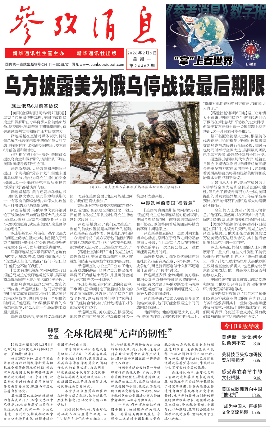 今日报纸头版:①乌方披露美为俄乌停战设最后期限②韩媒文章:全球化展现“无声的韧性”更多消息请关注→网页链接