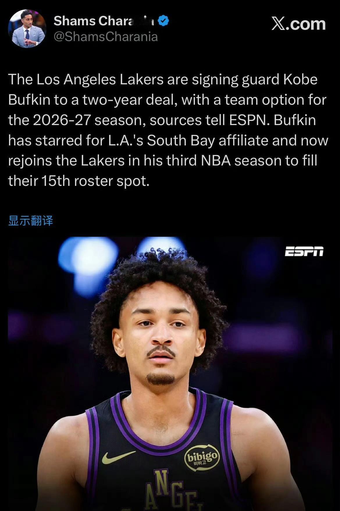 科比来了!湖人签约科比.巴夫金2年合同,2026-27赛季球队选项。 这样巴夫金填满了湖人第15人的名额。按照以往惯例,巴夫金签的是底薪,由于赛季还有30场左右,他拿的是87万左右的底薪。 本赛季两位湖人球员蒂米和巴夫金,去年9月曾在篮网参加了媒体日。此后效力于湖人队的南湾附属球队。