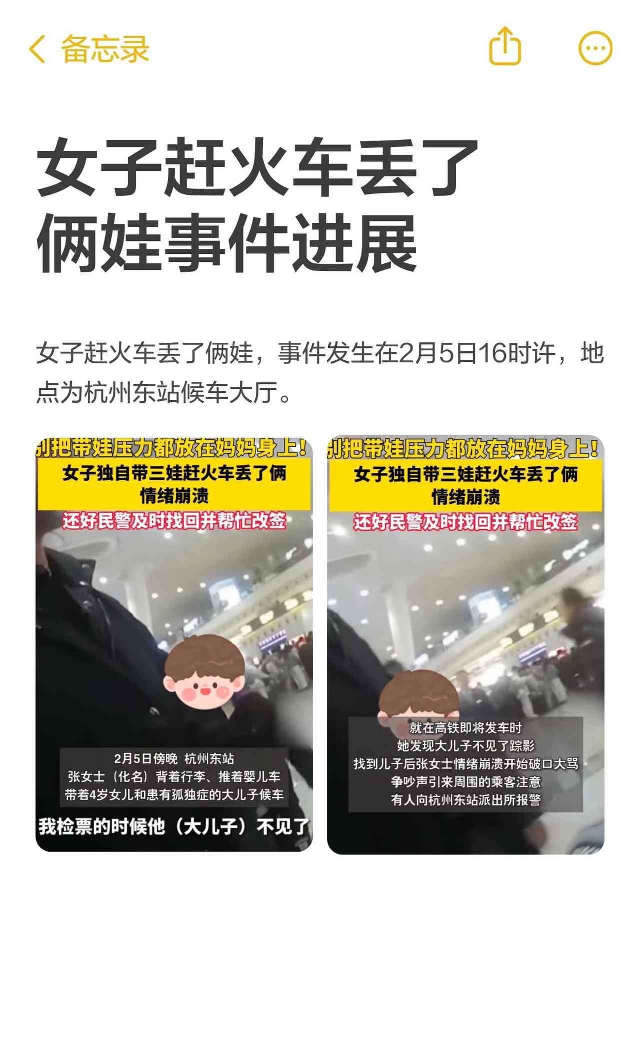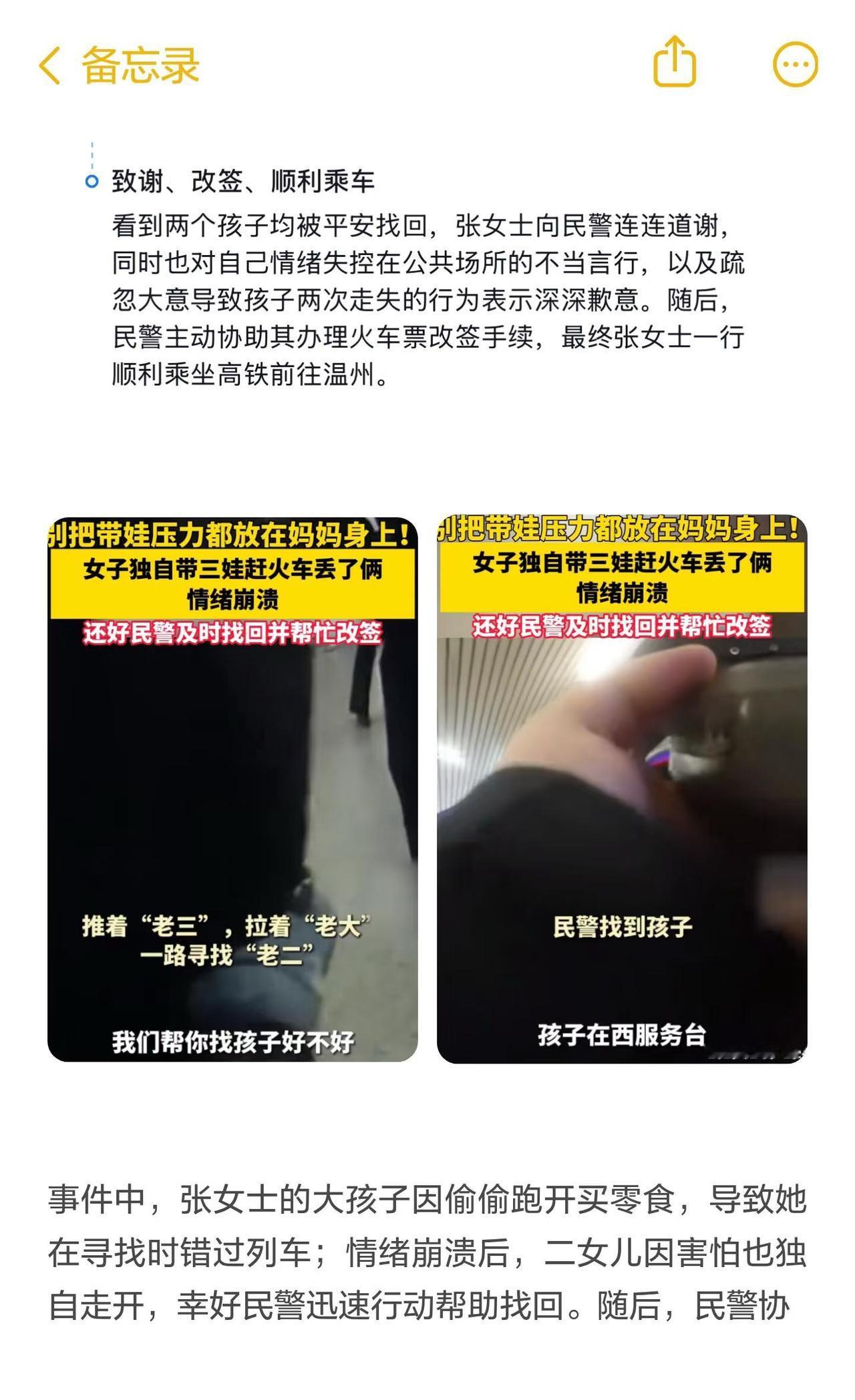 女子赶火车丢了俩娃事件进展 杭州东站候车大厅,张女士因寻找走失的大孩子错过列车,情绪崩溃后二女儿也独自离开。民警迅速行动,帮助找回并协助改签,顺利乘车。警方提醒家长春运期间务必全程看护好孩子,谨防走失。火车 孩子安全 春运 杭州