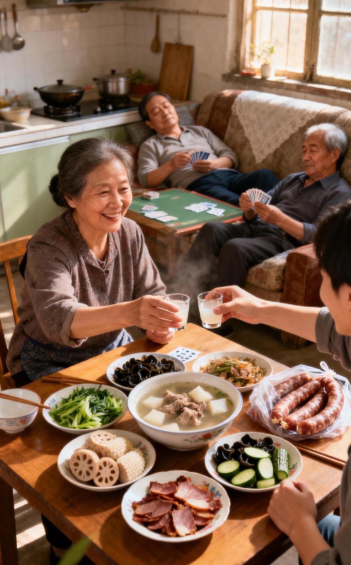 陪老妈喝了杯热米酒,才懂最香的年味,从来都在自家饭桌上 昨天,我特意回了趟老家,就想安安静静陪老妈待一天。 一进门,就闻见厨房里飘着香,嫂子早早就忙活开了,炖了一锅排骨萝卜汤,炒了蒜香青菜,拌了爽口的木耳黄瓜,还蒸了我最爱的糯米藕,四菜一汤,摆得满满当当。 怕菜不够,嫂子又切了一盘自家腌的腊味,烫了一把青菜,简简单单,却全是家里才有的味道。那袋腊味是我前阵子托人带回来的,老妈尝了一口,直说香,比街上买的地道多了。 老妈这阵子身子舒坦了些,中午总爱抿一口自家酿的米酒,不多,就小半杯,温温热热的,喝着暖胃又舒心。 嫂子做的菜实在太合胃口,我吃得心满意足,看着老妈一个人端着酒杯慢慢喝,忽然就想坐下来,陪她碰一杯。 我把杯子往老妈面前一推,笑着喊:“妈,给我也倒点,我陪你喝两口。” 老妈眼睛一下子亮了,乐呵呵地拿起酒壶,小心翼翼地给我斟了小半杯,手都带着点雀跃。 嫂子在旁边笑着嗔我:“哪有让妈给你倒酒的,该你孝敬她才是。” 我摆摆手:“我跟我妈不讲这些虚礼,谁乐意倒就谁倒,开心最重要。” 一旁的老爸听得直笑,偷偷朝我眨了眨眼,满是纵容。 酒不多,两口就见底,我端起杯子跟老妈轻轻一碰,认认真真说:“妈,愿你身体舒坦,天天都开心。” 老妈笑得眼角都皱了,却不忘叮嘱我:“别总熬夜忙工作,少操心,多睡觉,身体才是本钱。” 午后的阳光暖融融的,我躺在老家的沙发上,踏踏实实睡了一觉,没有工作烦扰,没有琐事挂心,睡得又沉又香,是在城里多久都睡不出的安稳。 醒了之后,一家人围坐在一起打纸牌,老爸、老妈、嫂子,还有小侄子,热热闹闹挤一桌。 本想着让着爸妈点,没想到二老手气好、脑子灵,算牌比我还清楚,我从头输到尾,最后一把好不容易才扳回几分,一点没掺水,输得心甘情愿。 玩了快一个钟头,我得回城了。刚起身,嫂子就往我包里塞东西,自家灌的肉肠、腌好的糖蒜、坛子里捞的咸鸭蛋,塞得背包沉甸甸的,连手提袋都装得满满当当。 每次回家都是空包去,满包回,装的哪里是吃食,全是家人的惦记。 老爸照旧坚持要送我,从屋里送到楼下,又踩着薄雪一路送到小区门口。老家的风有点凉,雪粒打在脸上微微发疼,我催了好几遍,让他赶紧回去,别冻着,他才慢慢往回走,走几步还回头望。 站在路口看着他的背影,忽然就鼻子发酸。 有爸妈在,有兄嫂在,老家就永远是最暖的港湾,再简陋的饭菜,也比任何山珍海味都好吃,再平凡的日子,也满是烟火温柔。 临走前,老妈拉着我的手问:“下次啥时候回来?” 我笑着答:“元宵节就回,没几天了。” 算一算,离正月十五也就二十多天,想想就觉得心里甜滋滋的。 其实每次回老家前,我都有点犯愁,车程远,一路颠簸总不舒服,可一想到推开家门就能看见爸妈的笑脸,闻到厨房里的饭菜香,所有的疲惫和烦躁都烟消云散。 以前总觉得,回家是我在孝敬父母,给他们带去陪伴和欢喜。 如今才慢慢明白,我回家,更是在治愈自己。是父母的牵挂、家人的温暖,填满了我在外漂泊的孤单,圆了我藏在心底的乡愁。 原来最好的幸福,从来都不是大富大贵,而是家人闲坐,灯火可亲,有热饭吃,有亲人陪,有一句“等你回家”。 你有多久没好好陪爸妈吃一顿饭、喝一杯茶了?有空,常回家看看吧。家庭自制米酒 米酒养生吃法 冬日温米酒 家常米酒酿 自制甜米酒 第一次做米酒 花香米酒