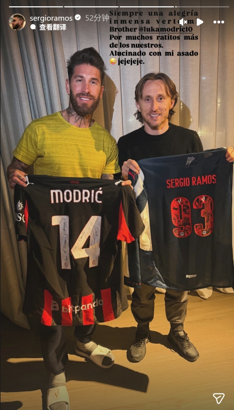 拉莫斯社媒晒出与莫德里奇交换球衣的照片,并配文:“见到你总是无比开心,我的兄弟卢卡·莫德里奇,愿我们还有更多这样的美好时光。我的烤肉简直太棒了,哈哈哈。”