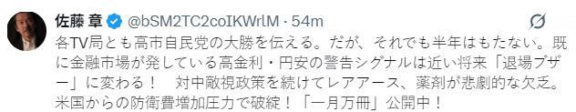 2月8日,高市早苗虽获大胜,但“唱衰”她的人已经不少,日本记者佐藤章断言:“高市早苗的政权绝对支撑不过半年!” 高市早苗在2月8日的选举中拿下大胜,看似坐稳了首相宝座,但佐藤章的判断绝非空穴来风,这背后藏着的三重困局早就像定时炸弹一样开始倒计时。 先说说经济层面,金融市场的反应从来不会说谎,选举结果一出,日元就跌到了1美元兑157.76日元的两周新低,距离之前159.45的低点只有一步之遥,交易员们都在盯着162这个可能触发政府干预的红线。 高市一直喊着要搞积极财政政策,还想暂时降低食品销售税,可日本本来就是发达国家里债务负担最重的,这种操作只会让投资者更慌,纷纷抛售日本国债。 之前1月20号的时候,30年期日本国债收益率都冲到3.88%的历史高位了,虽然后来稍微回落,但高市胜选后“高市交易”卷土重来,国债收益率肯定还得往上走。 更要命的是,日元贬值看着让日经225指数创了新高,可普通日本人根本享不到这份红利,进口商品涨价导致物价飞涨,工资却没跟上,民生压力越来越大,而高市政府眼里只有扩军和刺激政策,把养老、福利这些民生问题抛到了脑后,这种只顾面子不顾里子的经济政策,迟早会被民众用脚投票。 再看供应链问题,高市一门心思推行对华敌视政策,简直是在拿日本的经济命脉开玩笑。 日本对中国稀土的依赖度虽然从之前的90%降到了70%,但在高端领域根本绕不开中国,尤其是电动汽车驱动电机需要的高性能磁体,里面的镝、铽等重稀土元素,日本几乎完全依赖中国进口。 2010年钓鱼岛争端时,中国稀土供应波动就让日本企业吃够了苦头,现在高市还敢加码对抗,中国已经加强了两用物项的出口管制,这些既能民用又能军用的产品受限,直接戳中了日本军工和高端制造业的命门。 野村综合研究所早就算过账,如果中日关系持续恶化导致稀土供应限制一年,日本经济损失会达到2.6万亿日元,GDP要下降0.43%,这对本来就复苏乏力的日本经济来说,无疑是雪上加霜。 更别说医药制剂领域,日本的汉方制剂在国际市场占了80%的份额,可这些产品的原材料大多来自中国,一旦供应链出问题,不仅普通民众买不到常用药,相关产业还会大面积停摆,这种灾难性短缺可不是靠临时囤货就能解决的,日本费劲巴拉搞的“地球”号深海探测船挖稀土,短期内根本顶不上用,高端技术瓶颈更是没那么容易突破。 最后是外交安全上的死结,高市把日美同盟当成救命稻草,可这根稻草其实是块烫手山芋。 美国早就要求日本把防卫费提升到GDP的2%,高市不仅提前达标,还把2026财年的防卫预算涨到了9.04万亿日元的历史纪录,这么多钱砸进去,只能靠压缩民生支出,自然引发国内广泛反对,前首相鸠山由纪夫都直言她的言行严重背离《日中联合声明》。 更尴尬的是,美国只把日本当成亚太战略的棋子,根本不管日本的实际利益,高市为了讨好美国,把“台湾有事”和日本“存亡危机事态”挂钩,还和菲律宾搞准军事同盟,试图编织反华小圈子,可这些操作根本没人买账。 印尼、菲律宾等国明确对可能带来麻烦的军事合作保持警惕,就连欧洲盟友也不认同她的对抗性路线,法国作为G7轮值主席国就公开说G7不应针对中国。 高市一心想修宪扩军,推动日本获得“反击能力”,甚至试探修改“无核三原则”,这种军国主义回潮的苗头不仅让周边国家警惕,日本国内的抗议活动也从没停过,“继承和发展村山谈话会”专门举行集会反对她的强军扩武行径,再加上她为了推进议程搞“闪电选举”,还被曝光政治资金不当往来,执政根基早就动摇了。 一边是美国不断加码的防卫费要求,一边是国内民众的强烈反对,一边是外交上的孤立无援,高市的外交安全政策完全是顾此失彼,只会把日本推向更危险的境地。 这三重问题层层叠加,经济扛不住汇率和债务的压力,供应链躲不开对华依赖的现实,外交安全解不开日美同盟的捆绑和国内的反对,就算高市现在选举赢了,也不过是暂时的风光,用不了半年,这些积累的矛盾迟早会集中爆发,让她的政权撑不下去。
