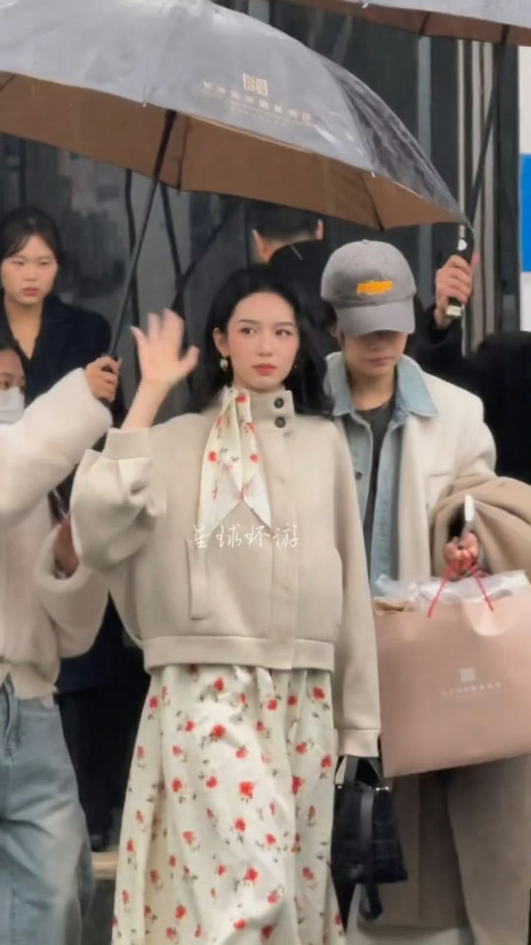 周也白色碎花裙look 周也下雨也在打招呼