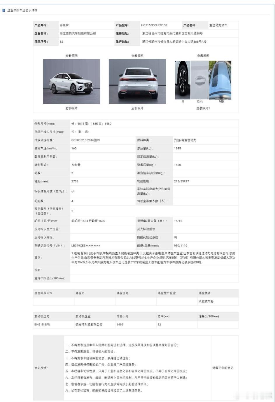全新吉利帝豪HEV 混动车型,正式申报工信部404批目录,主打普通人实用省心需求,不玩虚配置。该车搭载1.5L发动机和欣旺达锂电池,采用i-HEV混动系统,核心特点是无需外接充电,靠发动机和刹车自补电,加油就能走,无续航焦虑,适配无充电桩场景。该车发动机最大功率79kW,动力足够日常代步,混动系统可降低油耗,节省油钱。欣旺达电池质量稳定,后期维修便利。参考现款帝豪燃油版定价,该车大概率亲民,有望成为普通人买得起、用得省心的热门混动车型。新车资讯