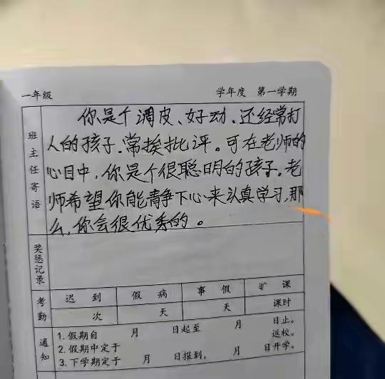 有人质疑这张学生期末鉴定评语是不是老师写的? 可能是,也可能不是! 之所以有人怀疑这字不是老师写的,就是因为这字体有些幼稚,作为老师应该比这写的更漂亮一些,我认为这字出自老师之手一点也不奇怪,当代年轻人电脑打字,语音输入手写机会大大降低,所以好多大学生的字真的不敢恭维! 所以一些老师的板书也同样受到影响,老师板书的整体水平在下降,这是事实! 如果说这字不是老师写的,也有可能因为老师工作忙,也许会让别人代写评定语! 如果是请人代写的评语,总要比有些老师在网上打印,然后贴纸条的办法好多了,至少看这位老师写的评语很中肯,也很符合学生的实际,淘气是学生的缺点,但是老师马上找到他的闪光点,说学生在老师眼中是一个很聪明的孩子,这是对学生的鼓励,也许学生看到老师在鼓励他,以后会改掉自己特别淘气,不听话的缺点,努力学习了,会有更大的进步!