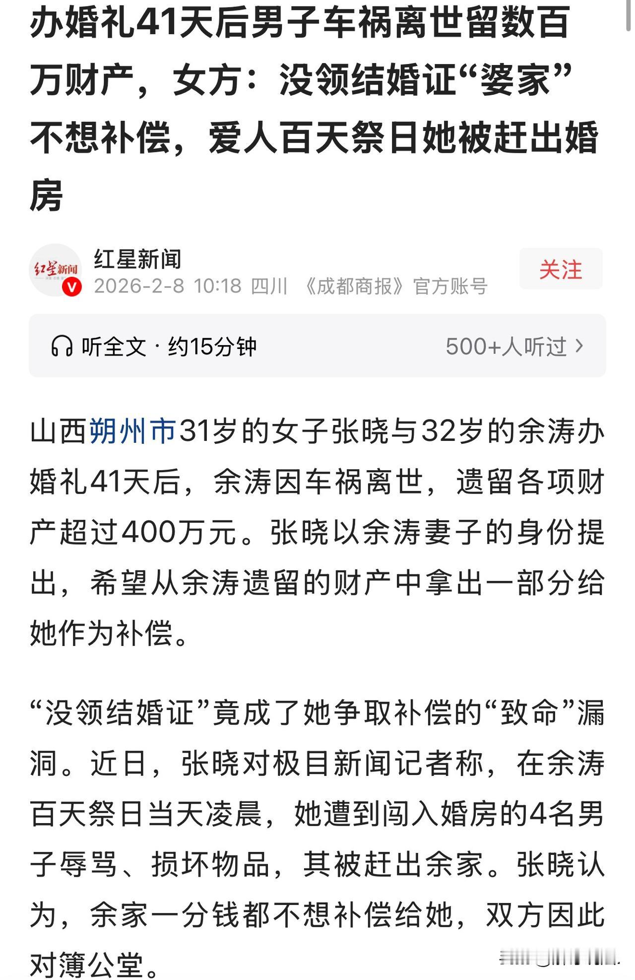 “太没良心了!”山西朔州,31岁女子和32岁男子举办了婚礼,未领证。婚后没多久,丈夫意外车祸去世。女子为丈夫办了葬礼。谁知,丈夫尸骨未寒,婆婆就过来抢走了丈夫留下的400万遗产,还找来4个人将她扫地出门。并把她告上法庭,要求她返还49.7万彩礼。女子见婆婆欺人太甚,直接将婆婆告上法庭,要求分割200万遗产。 在北京打拼多年的张晓,从事审计工作,常年忙碌得无暇经营感情。 2023年底回老家过年,父母急着为她张罗终身大事,经媒人牵线,她邂逅了同样在北京闯荡的余涛。 漂泊异乡的共鸣让两人一见如故,好感迅速升温,2024年确定恋爱关系后便果断同居,把北京的小出租屋打造成了温馨小家。 余涛是程序员,天天加班至深夜,周末也难得休息。 张晓主动扛起所有家务,买菜做饭、打理琐事,还贴心帮他照料网店副业和共同理财账户。期间,两人工资、存款混为一体。 2024年4月,他们在太原选中一套136万的婚房,41万多的首付,每月五千余元。 同年10月订婚仪式,2025年5月7日的婚礼更是亲友齐聚、举杯祝福,张晓身着婚纱,以为终于握住了期盼已久的幸福。 原本约定5月20日这个寓意“我爱你”的日子领证,可余涛突然接到期盼已久的新工作入职通知,这份来之不易的机遇让他格外珍视,两人商量日后补领。 谁也没料到,噩耗便猝不及防地砸来。 2025年6月11日,余涛骑摩托车上班途中遭遇车祸,张晓接到电话后如晴天霹雳,迅速赶往医院,缴纳急救费,并在病危通知书上签字。 余涛的母亲和弟弟连夜赶来,两家人守在重症监护室外日夜祈祷,可七天后,余涛还是没能挺过来,永远离开了。 葬礼上,张晓按老家风俗以妻子身份为余涛端灵、抱骨灰盒,每一个动作都沉重得令人窒息。 余家人当时未提任何异议,余涛的弟弟一口一个“嫂子”,让沉浸在悲痛中的张晓,以为这份“家人”情谊能延续下去。 余涛留下的财产颇为丰厚:近270万的保险理赔款、预估百万的工亡赔偿金,加之婚房首付和共同存款,总价值超400万。 起初,两家人还能心平气和地梳理财产、沟通理赔,张晓毫无防备地交出了余涛所有文件资料,她以为,即便没有结婚证,这段感情、这场婚礼与送终情分,总能让彼此好聚好散。 可随着一笔笔理赔款陆续打入余母账户,余家人的态度悄然改变。 曾经的温和不见踪影,取而代之的是刻意疏远,余涛的手机也被“婆婆”悄悄拿走,之前热络的沟通变得冷淡敷衍。 她觉得自己虽未领证,但婚礼已办、有夫妻之实,余涛病重时忙前忙后,离世后以妻子之名送终,于情于理都该得到一点补偿。 可多次协商换来的都是推诿扯皮,村干部调解时,余母口头答应给30万,却迟迟未兑现,这份口头承诺像一根刺扎在张晓心上。 最让张晓心寒的一幕,发生在2025年9月24日,余涛去世百天的祭日。 凌晨时分,睡梦中的张晓被嘈杂声惊醒,4名男子气势汹汹地闯进婚房,其中就有余涛的弟弟。 他们对着张晓和赶来陪伴的父母破口大骂,污言秽语不堪入耳,还动手砸东西、撕扯墙上的婚纱照,那张记录甜蜜的照片被狠狠摔在地上,碎成一地狼藉。 张晓又气又怕、泪水直流,最终被硬生生赶出了这个曾满心期待的“家”,无奈之下只能报警。 温情彻底撕碎,两家人反目成仇。2025年10月,余母一纸诉状将张晓告上法庭,要求返还18.8万“彩礼”、红包及其他费用共49.7万,声称自己是余涛唯一法定继承人,这些钱均为不当得利。 张晓又气又委屈,反驳称这些钱是两人共同花销和相互赠与,绝非彩礼。 法院一审以证据不足驳回余母起诉,可余母不服上诉。 2026年1月,朔州中院撤销一审裁定,指令重新审理。 与此同时,张晓提起诉讼,要求分割同居期间共同支出、理财盈余、理赔款和婚房支出共200多万,要为自己的付出讨个公道。 而余家人则另案起诉张晓,称她转走余涛7万元,张晓解释这是两人共同理财收益和变卖摩托车的钱,却未被认可。 余涛的妹妹回应,余家并非不想补偿,是张晓抱着余涛遗像在村里用喇叭诉苦让他们难堪,且张晓还房贷的钱疑似来自余涛账户,没领证也是后来才知晓,可张晓心里清楚,当初的极端举动是协商无果后的无奈之举,村里流传的“百万补偿”谣言,让她不得不站出来澄清。 曾经的准婆媳、准姑嫂,如今在法庭上针锋相对,三个案件均在等待法院裁决。 当初参与调解的村干部感慨,俩人办了婚礼还送了终,即便没有结婚证,在农村眼里就是一家人,婆家多少该给些补偿。 网友对此说法不一: 虽然没领结婚证,但是已举办婚礼形成乡里乡亲公认的事实婚姻,她应当受到法律的保护并且享受到受益人资格。 分钱可以,是男方家的人,那就别改嫁。如改嫁就是外人,为何要分给外人。给是情分,不给也不违法!