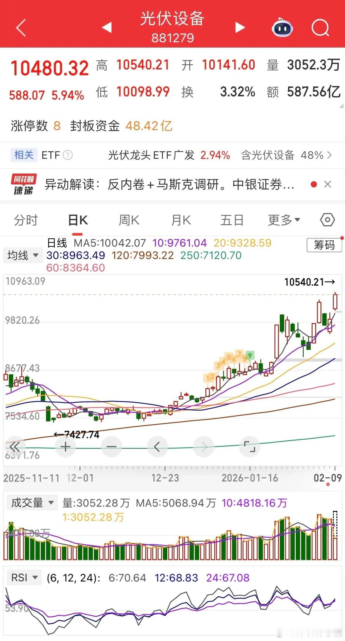 板块层面呈现轮动特征,光伏设备板块领涨全场,涨幅超6%成为市场核心主线,太空光伏细分方向延续强势表现,成为当前持续性最优的赛道;CPO板块同步发力大涨超4%,地产板块紧随其后涨超3%,半导体板块稳步上行涨超2%。商业航天板块冲高回落,机器人板块则表现弱势,龙头永赢收绿1%,与上周领涨行情形成鲜明对比,凸显当前市场板块轮动节奏加快的特征。