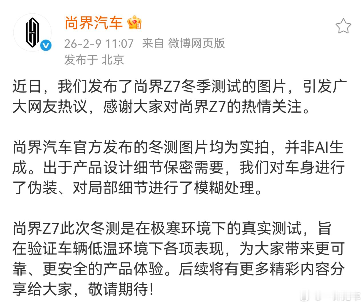 尚界官方发布公告,感谢大家对尚界Z7的热情关注。尚界Z7此次冬测是在极寒环境下的真实测试,官方发布的冬测图片均为实拍。