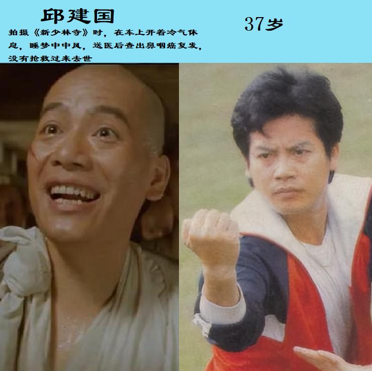 生老病死,谁也不能提前预知,这些演员都是在戏拍到一半突然离世,最小的只有26岁,看看有没有你不认识的。 邱建国,全国的武术冠军,连续6年获得了南拳的冠军,随着《少林寺》的热映,进入了影视圈当演员,因《南拳王》走红,在拍戏的时候,吹的冷风过冷导致中风癌症复发,去世的时候只有37岁。 孟庭丽 ,台湾的女星,早期以模特的身份入行,演过很多热播的影视剧,《包青天》《香帅传奇》《欢喜游龙》等等,为了改善家人的生活,一直忙着工作,有“拼命三娘”之称,可惜累倒在片场,去世时刚刚50岁。 于月仙,内蒙古走出来的女星,年轻时长相靓丽,演了很多古装剧中的美人,但一直没有走红,直到参与了姐夫赵本山的作品《乡村爱情》,凭借谢大脚被观众知晓,事业的转型期间,拍戏突然发生车祸,去世后没有留下一儿半女。 李小龙和儿子李国豪,父子同命,特别是儿子李国豪,拍戏时被道具枪中射出的真子弹打中,离奇的死因至今都是一个迷。