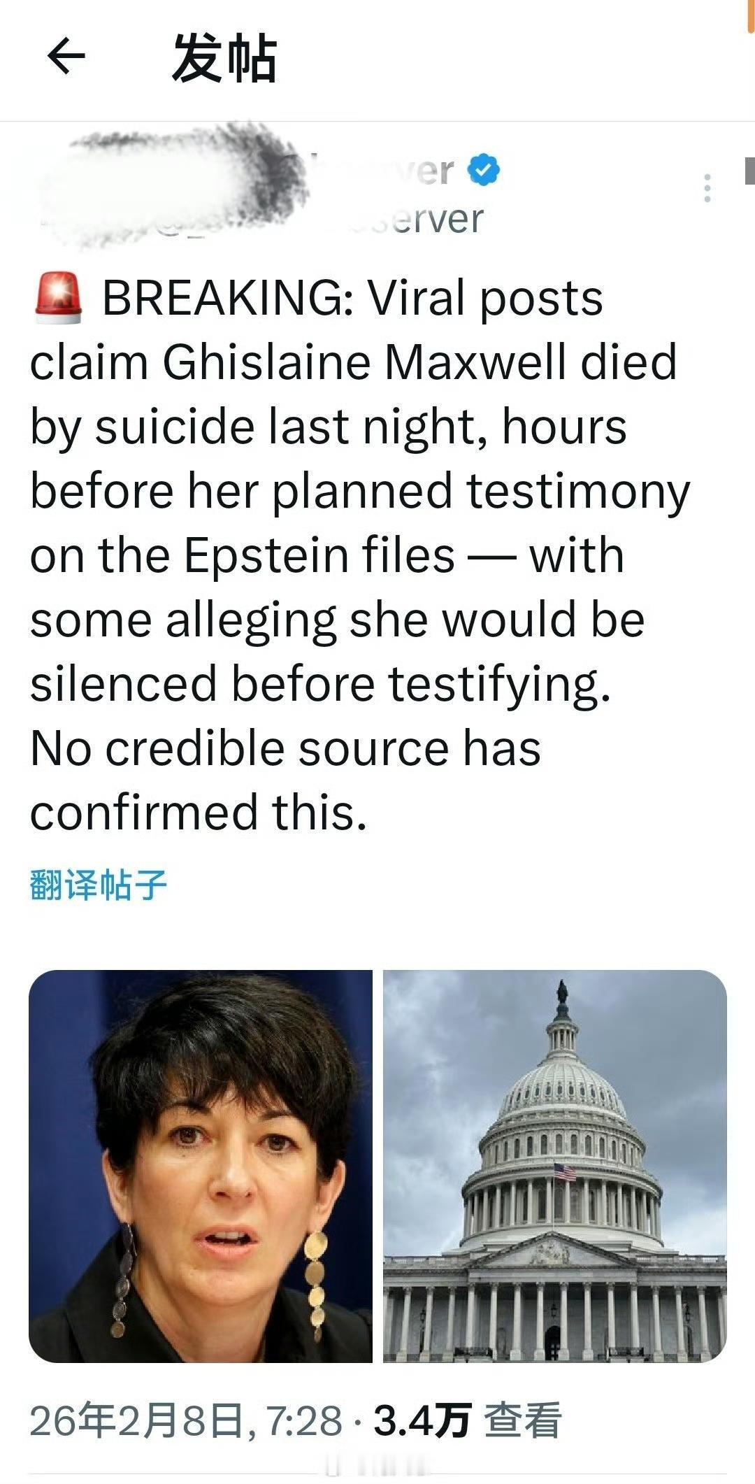紧急消息:网上疯传的帖子称,吉丝莱恩·麦克斯韦尔昨晚自杀身亡。 就在她计划就爱泼斯坦相关文件作证的几个小时前——早前就有人声称,在她作证前她会被迫保持沉默。 目前尚无可靠消息来源证实这一消息。 她是爱泼斯坦的前女友,也是跟了他很久的帮手。她被指控参与了爱泼斯坦的犯罪活动,专门锁定家庭贫困、监护缺失的14-17岁少女,在艺术夏令营等场所伪装"知心姐姐",以"艺术奖学金""高薪兼职"为诱饵骗取信任,然后提供给爱泼斯坦玩乐。2021年她已经被判了罪,之前正在坐牢。 最近两年,跟爱泼斯坦案有关的一大堆保密文件被公开了,里面提到了好几百个相关人员的名字。麦克斯韦作为关键证人,如果她出来作证,外界都觉得她很可能会抖出更多大人物的丑事。 这次“麦克斯韦自杀”的谣言,正好赶在她要为新公开的文件出庭作证的节骨眼上,一下子就戳中了大家的痛点——很多人本来就怀疑这背后有“系统性掩盖”,谣言一出来,大家就更觉得“果然是要杀人灭口”了。 到底是金蝉脱壳还是“紧急自杀”?从爱泼斯坦当年在狱中“自杀”开始,这案子就充满了各种经不起推敲的细节。摄像头“恰好”故障,看守“恰好”打瞌睡,现在轮到麦克斯韦,又是熟悉的配方,熟悉的味道。