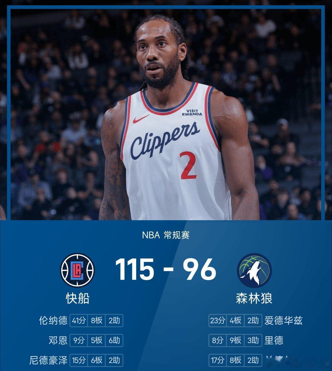 快船vs森林狼nba森林狼96-115不敌快船。伦纳德砍下全场最高的41分8板
