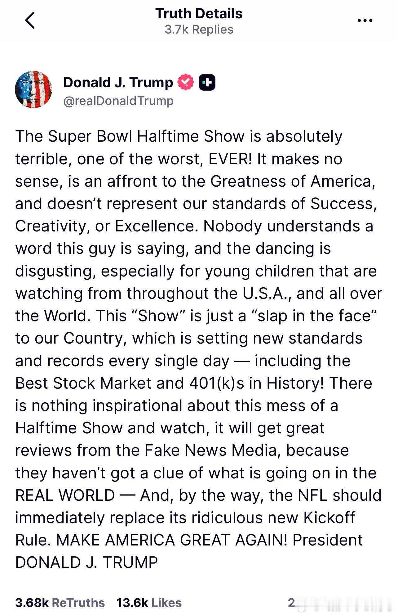 “超级碗中场秀简直糟透了,是有史以来最差的之一!毫无意义,这是对美国伟大精神的侮辱,也根本不代表我们的成功、创造力和卓越标准。没人能听懂这个家伙在说什么,舞蹈更是令人作呕,尤其是对那些在美国各地乃至全世界收看的孩子来说更是如此。