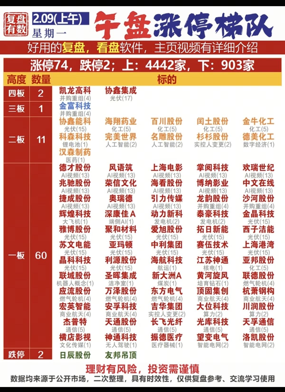 2.9周一 涨停板股票:复盘统计! 涨停板74家,跌停2家 涨跌比4442:903 焦点:太空光伏、化工,人工智能