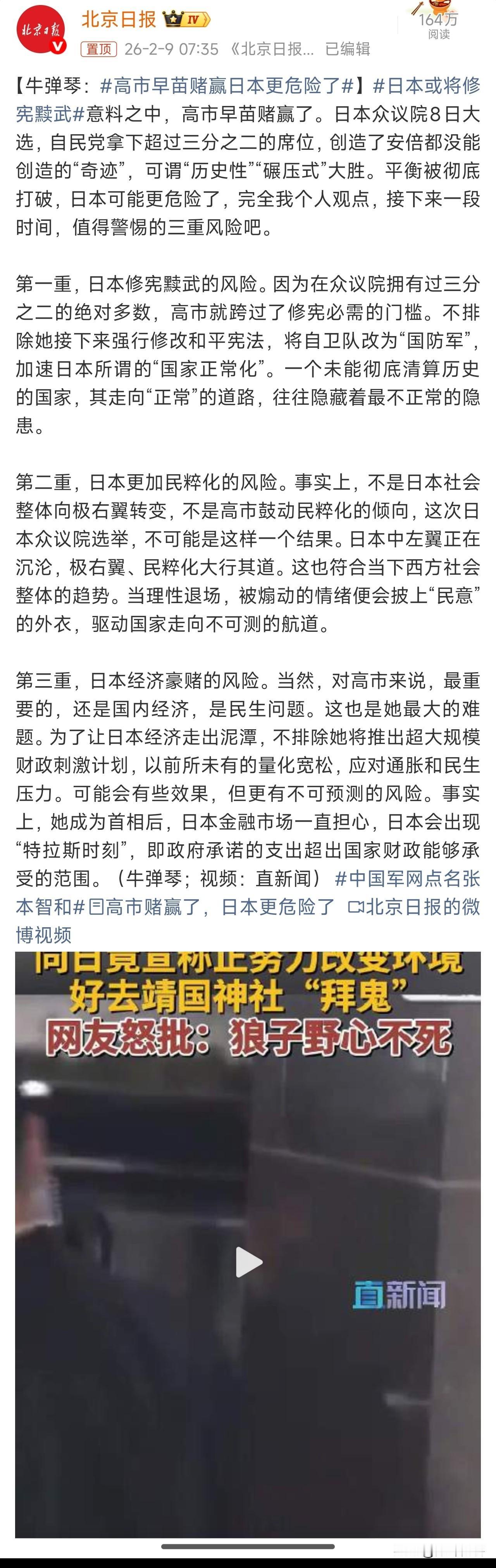 高市早苗赌赢日本更危险了,第一,高市早苗的赌赢,说明日本整个社会转向极右翼,军国主义已经不是复活、抬头的阶段了,而是要大肆地泛滥化了。 第二,日本政府几十年来的教育,都是在美化侵略史的基础上培养日本的年轻人。所以,日本整个社会弥漫着一种不是反思侵略史,而是反思当初的侵略怎么就失败了呢的思潮?他们怀念的是战败前的“日本帝国主义”时代! 第三,日本战败后,穷兵黩武的日本民族劣根性只是被更加强大的美国驻军暂时压制住了。但是,压制住并不等于彻底消灭了,根本也没有铲除,美国还在有意地扶持日本军国主义的重生。 第四,归根结底,二战之后,由于新中国实力并没有恢复到历史高峰,因此二战后的很多问题都没有力量和精力进行彻底地清算,自然也包括日本军国主义的彻底铲除。那么,如今的日本集体向右转,还要继续二战前的穷兵黩武的扩张军备的道路,那也是重新再给我们一次清算历史旧账的机会。所以说,如果再次清算历史旧账,一定不要心慈手软,一定要彻底铲除日本军国主义的毒根,重塑日本民族,解放日本人民!