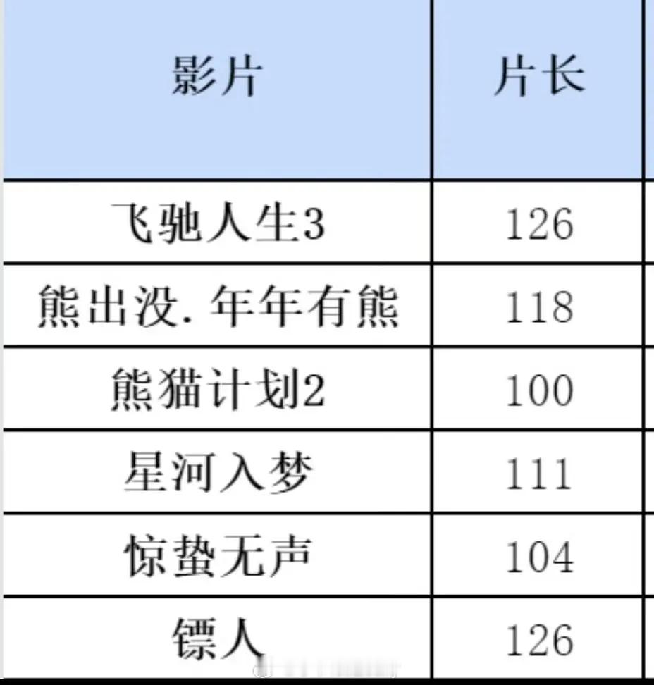 春节档🎬各片片长《飞驰人生3》126分钟《熊出没.年年有熊》118分钟《熊猫计划之部落奇遇记》100分钟《星河入梦》111分钟《惊蛰无声》104分钟《镖人:风起大漠》126分钟