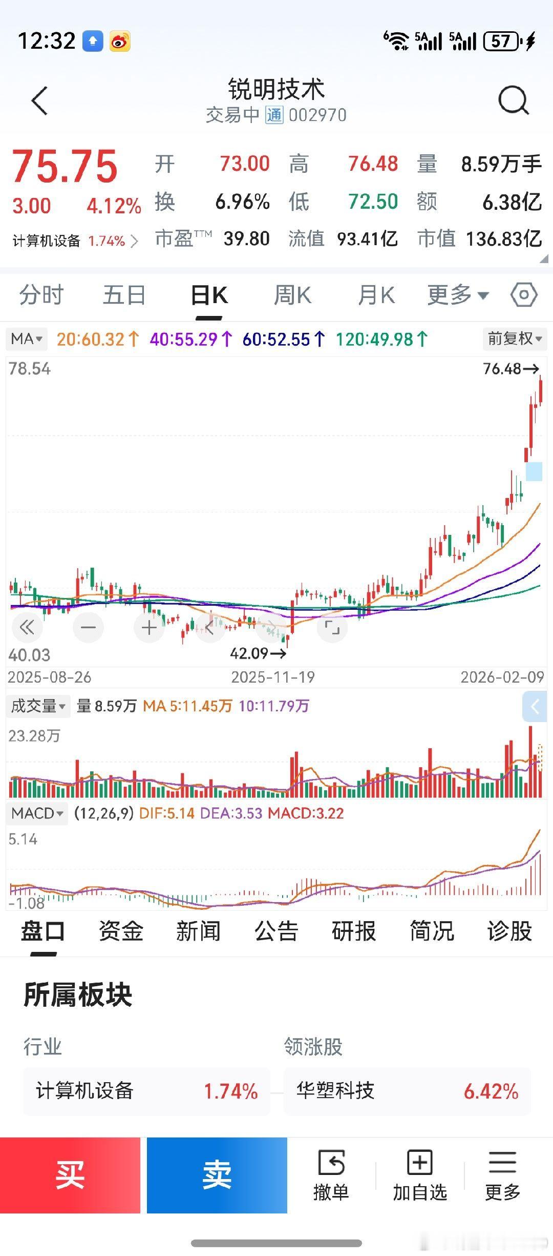 说一件亲身经历的事吧。2月3日,老鸭始终在看锐明技术。大盘反弹,它独绿。但中期均线之“三线平行”,清晰可见。老鸭是工作分心,心想第二天买总来得及。操盘手似乎知道老鸭心思,第二天高开。有时候,市场真奇妙!