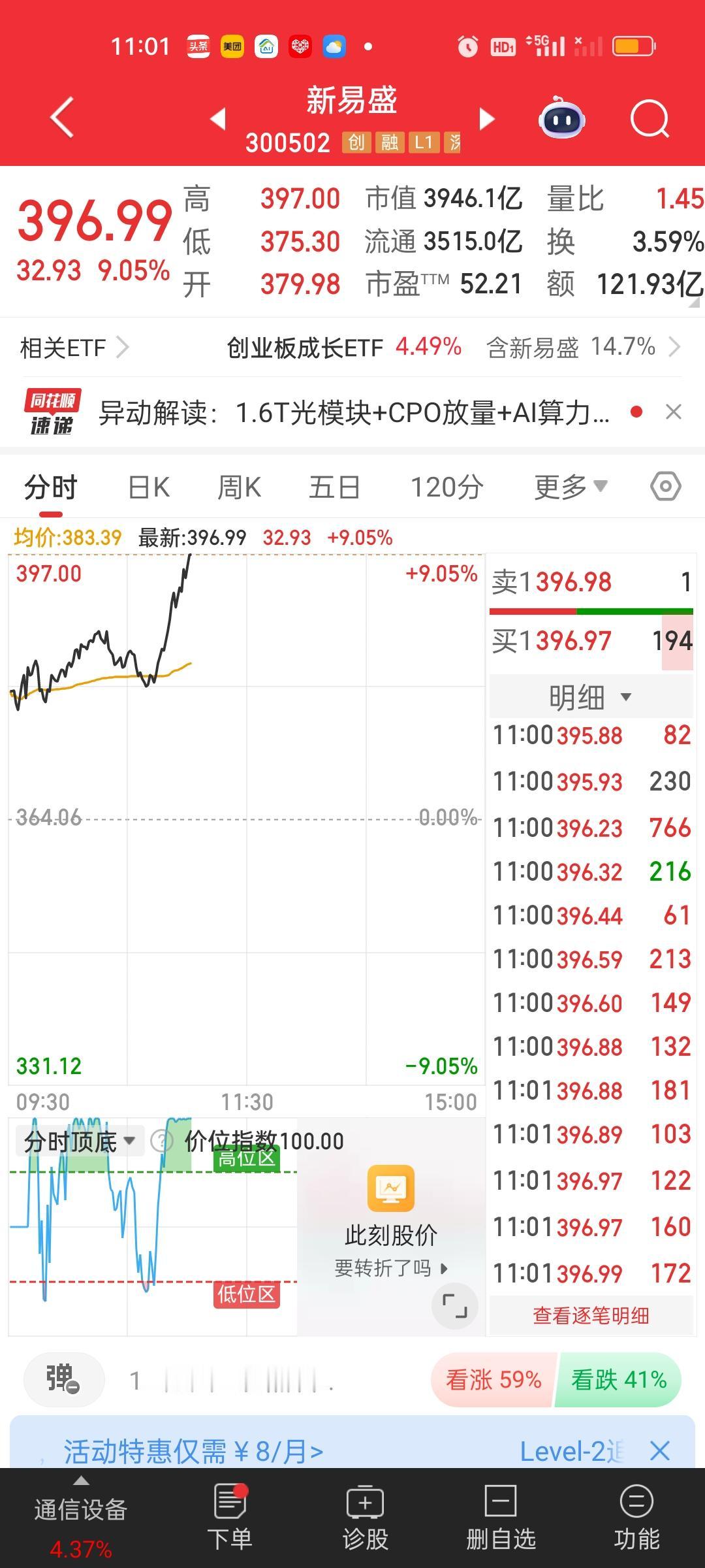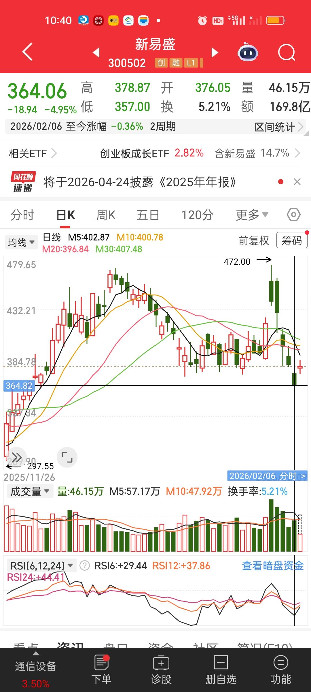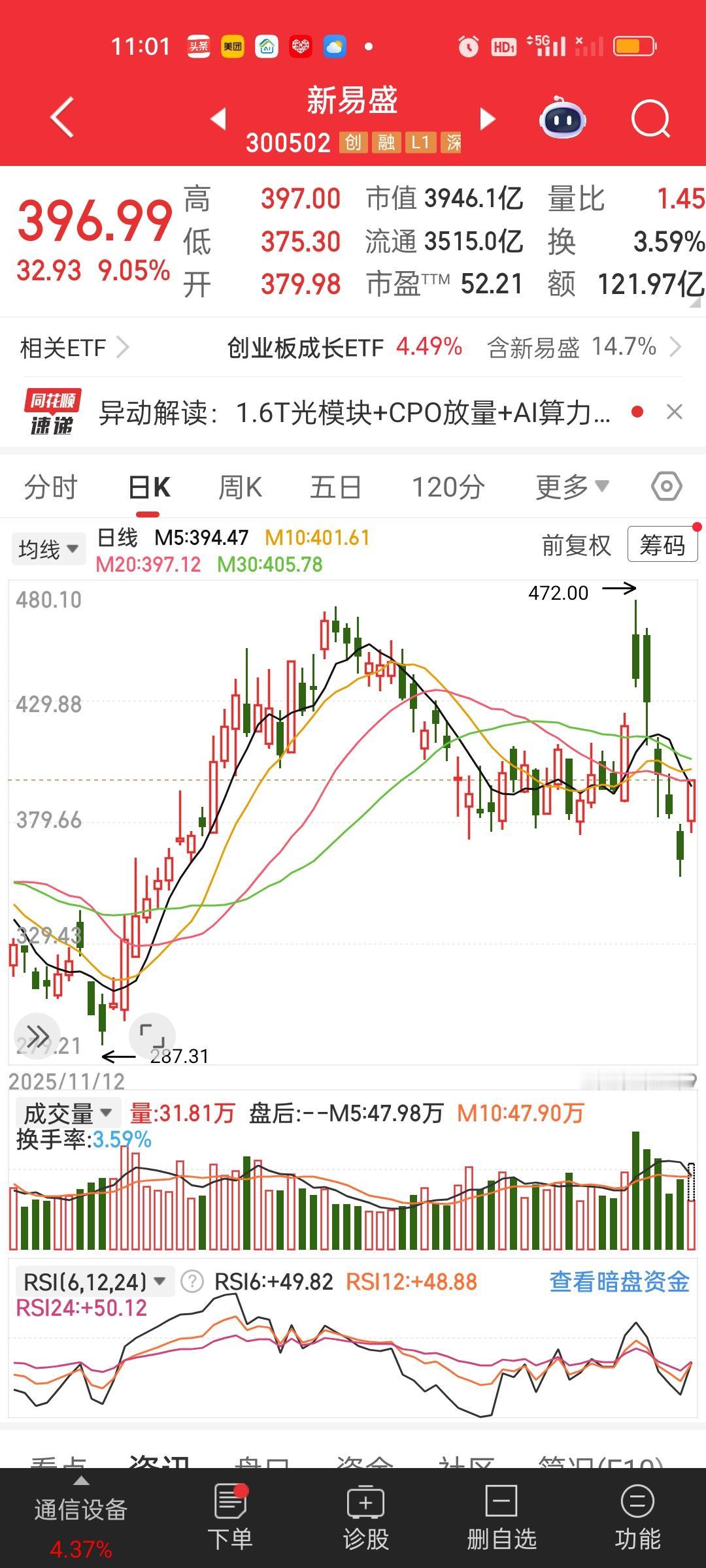 今天CPO板块迎来了大爆发,里面的核心个股涨幅都非常大,天孚20厘米,易胜接近10厘米,还有中际,胜宏和沪电涨得也可以。这里面就属易胜的走势最难看,之前连续5个交易日下杀,股价直接回到3个月前。 也就是说三个月的涨幅5个交易日就被杀的干干净净。472杀到了357,357/472=0.756,五天时间直接杀了25%。今天这根阳线似乎也并不解渴。恭喜还重仓CPO板块的好朋友们!