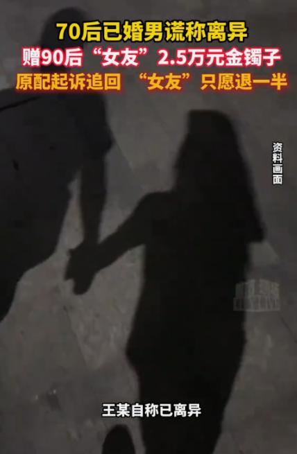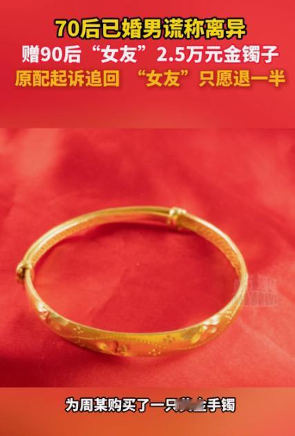 辽宁锦州,一 70 后已婚男子冒充单身与 90 后女牌友发生了关系,并给女牌友买了个价值 2.5 万元的大金镯子。 这男的也太气人了,送完金镯子转头就帮老婆往回要,一点情面都不留。 俩人是在棋牌室打牌认识的,男的一直说自己单身,还总给女的放牌,女的就对他有好感了。 后来俩人加了微信,没多久就在一起了,男的还花 25012 块给女的买了大金镯子,女的高兴坏了,对他更上心。 没几天,女的突然接到男的老婆电话,让她还镯子,她才知道自己被骗了,成了小三。 女的觉得委屈,说自己也是受害者,愿意退一半钱当补偿,可男的老婆不同意,非要全额返还。 俩人谈不拢,直接闹上了法院。 更离谱的是,到了法庭上,男的直接站老婆那边,说镯子是夫妻共同财产,支持老婆要回来。 法院查了之后,认定这钱是夫妻共同财产,男的没经过老婆同意就送人,还花了这么多钱,已经侵犯了老婆的权益,而且这种事也不合规矩,所以赠与无效。 女的在法庭上说镯子已经丢了,法院就判她把 25012 块钱全还给男的老婆。 这事网友也吵翻了,有人觉得女的被骗挺可怜,不该全还;也有人说不管知不知情,这钱本来就不是男的一个人的,就该全额退。 对此,你怎么看?