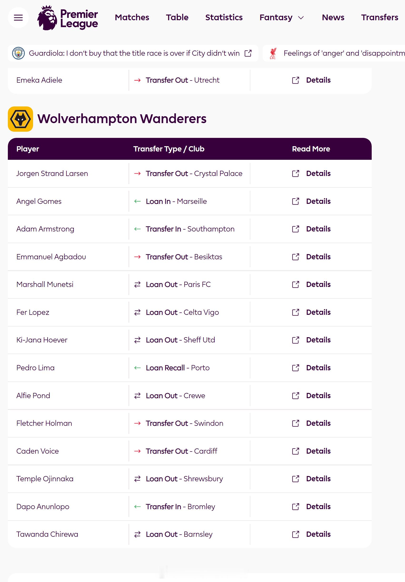 狼队转会列表不仅包括一线队球员的转出、转入交易,还包括U21、U18队球员的交易。例如,17岁Dapo Anunlopo加盟狼队梯队,19岁Caden Voice转出至卡迪夫城U21队等等。