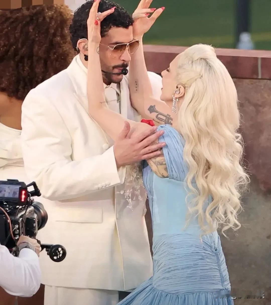 天呐!超级碗中场秀最大惊喜来了!坏痞兔正唱着歌呢,Lady Gaga突然从天而降! 这位39岁的天后,穿着淡蓝色裙子就上来了,开口就是和火星哥的《笑着离开》。这可是她自2017年主持中场秀后,第一次杀回这个舞台。最逗的是,唱完她还和坏痞兔现场来了段即兴热舞,全场都炸了。 今年这场秀可太有说头了。坏痞兔成了史上第一个全程西语表演的明星。这本来是个庆祝拉丁文化的大派对,连瑞奇·马丁都来助阵了。但听说有人不高兴,觉得“美国的比赛就该唱英文歌”。要我说啊,音乐哪有边界,快乐就完事儿了!你看Gaga一出来,谁还管歌词听不听得懂,跟着摇就对了! 这哪是中场休息,分明是文化盛宴加一点点“故意”的叛逆,看得人真过瘾! LadyGaga现身超级碗中场秀