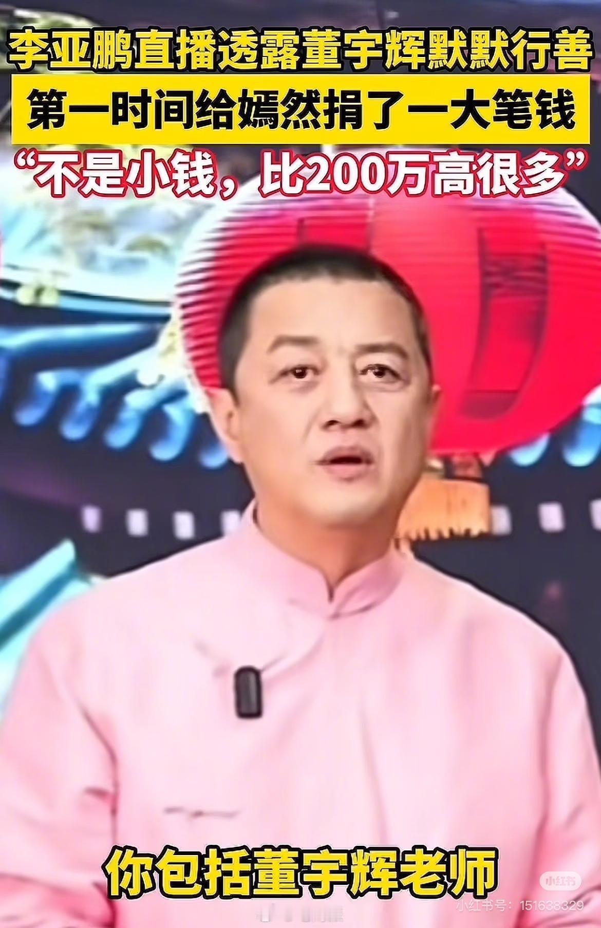 李亚鹏在直播间为董宇辉说话,给所有人提了个醒。 董宇辉在嫣然医院快关停时第一时间捐了钱,李亚鹏说金额比200万高很多,两人之前根本不认识,可董宇辉自己要求保密,结果被说没捐,李亚鹏看不下去才在直播里说。 董宇辉做慈善不是第一次,2024年海南台风他刚创业就捐了100万,和辉同行两周年累计捐了1200万,他向来默默做事不声张,这次被误解得太委屈。 做好事非得晒出来才算善良吗?