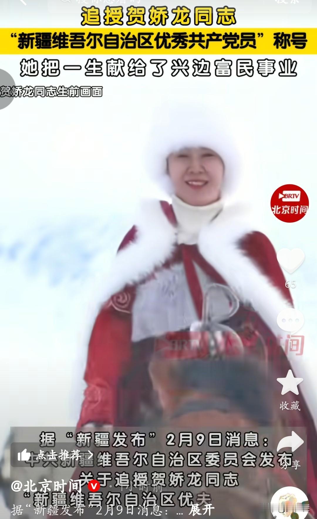 贺娇龙的抢救过程细节公布了,每一个字都让人揪心。 2025年12月,她在昭苏县拍摄时意外坠马,当时还能自己坐起来,意识清醒的她,在去医院的路上反复叮嘱“一定拍完”。之后,她被紧急送往医院,经历了两次开颅手术,但伤势过重,最终还是没能挺过来。 2026年2月9日,新疆追授她“自治区优秀共产党员”称号,表彰她把一生献给了兴边富民事业。从副县长到文旅局长,她身披红斗篷在雪地里策马的画面,让无数人记住了新疆的美,也记住了这个为家乡拼尽全力的干部。 她用自己的方式,把新疆的故事讲给了世界,也把自己的生命,永远留在了这片她深爱的土地上。