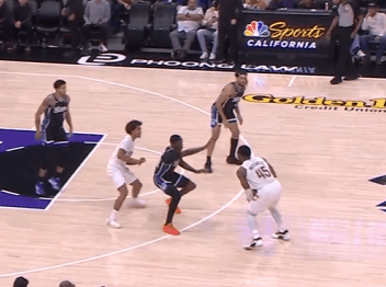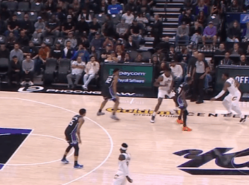 P5米切尔持球推进至前场后直接走右路,启动向中路的突破,误导威少后行进间迅速大回环合球变到左路——攻击威少前侧脚直接将其过掉,随后杀入篮下反手挑篮得手。慢动作细节呈现:P6