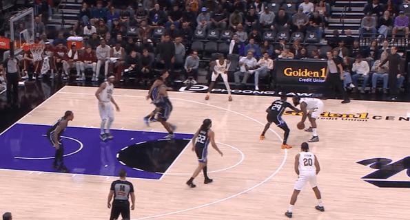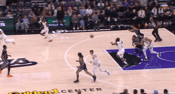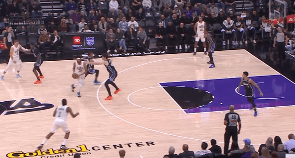 P6哈登上球给快下队友后无球落位至右翼,抓国王退防沟通问题获得完全空位。随后接米切尔传球,调整好脚步后大空位三分手起刀落。
