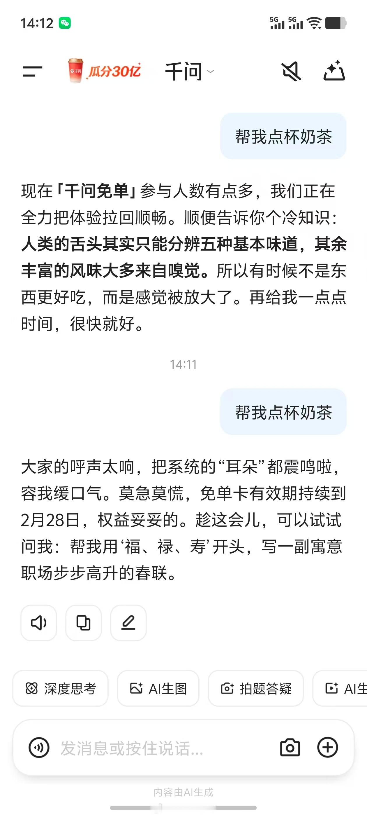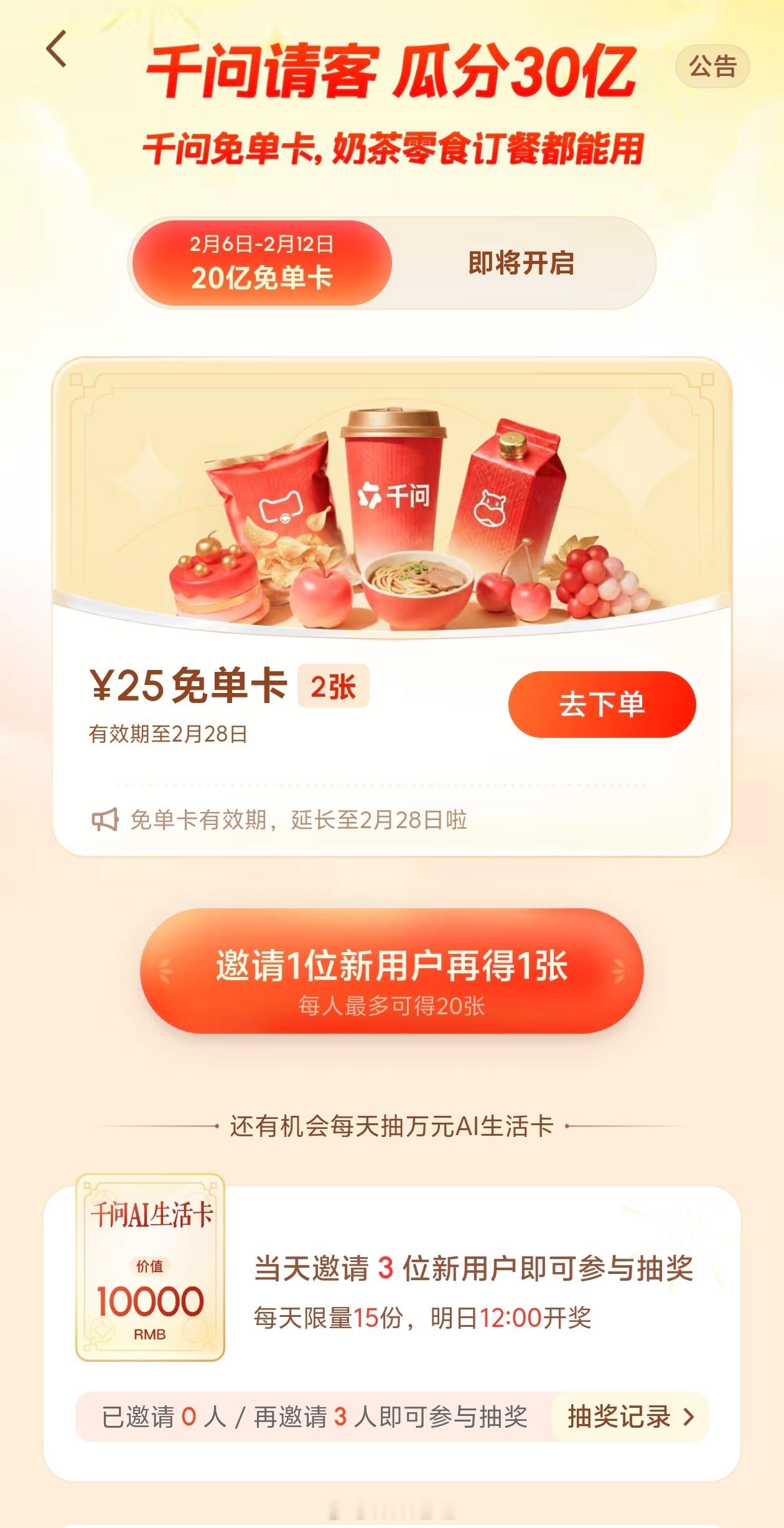 千问这服务器不太行呀,我还两张免单卡没用呢,周末点不了,现在还是点不了,不过倒是学聪明了,不卡死在那,直接提示参与人数太多。