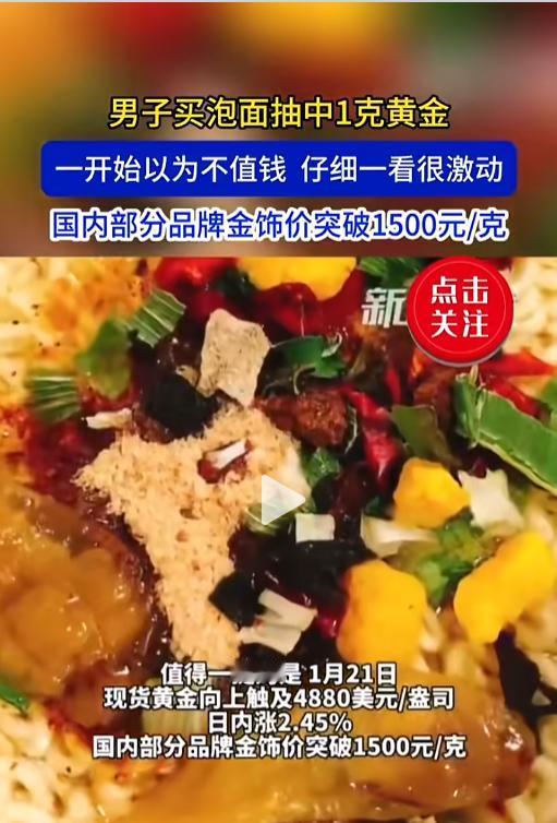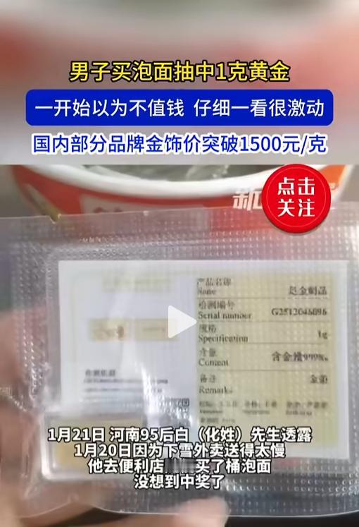 “这简直是捡钱啊!”近日,河南,一男子点外卖后因下雪天无人配送,就去便利店买了桶泡面充饥。打开后,里面居然有一张金色卡片。男子刚开始以为是个装饰品,吃完泡面一看竟然是真黄金,还带着鉴定证书呢!网友:我买的咋啥都没有! 现在很多商家出于促销或者回馈顾客的目的,都会在商品中做一些抽奖活动。黄金大奖一直都活在传说中,没想到今天遇上了。 据媒体报道,1月21日晚上,白先生下班后点了一份外卖,因为天气原因一直没有骑手接单。白先生实在是饿得慌,就先去便利店买了桶泡面,准备先对付一下。 白先生回到家泡面的时候发现,泡面盒子里面多一个塑料袋子,刚开始,他也没在意,就放在一边吃面了。吃完面后,他又拿起那个袋子,发现上面写着黄金包,仔细一看,竟有张一克的金卡和鉴定证书。 一想到现在的黄金价格这么高,白先生可高兴坏了,抓紧时间联系了客服核实。客服跟他确认,真的是中奖了,不仅如此,还额外又送了他一箱泡面。 网友看后表示,酸了酸了,这运气羡慕不来。还有网友表示,多亏了没有骑手接单,要不然这黄金大奖就属于别人了!这是现代版的塞翁失马啊,一时的不如意也没有什么大不了的,说不定这是惊喜的前奏呢! 信息来源:《男子