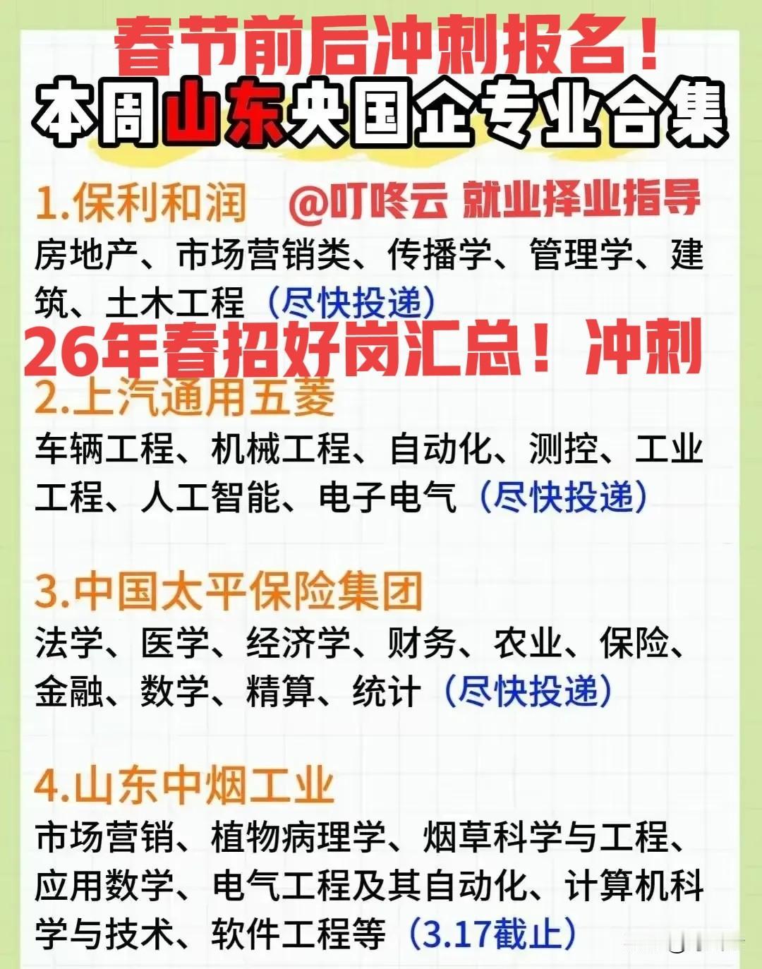 冲刺报名!8家央国企26年招聘要求汇总合集!春节前后冲刺报名,投递简历!速速收藏起来备用!山东中烟工业、上海通用五菱、国机集团、航天513所等公司重点关注!优选推荐这些国企大平台,岗位稳定福利好!天生我才必有用,千金散尽还复来!再努力一把,必定会上岸一家!速速围观揭秘详细内容![点亮平安灯][点亮平安灯][礼物][礼物] 欢迎关注@叮咚云 将优先为粉丝职业规划指导,为你定制最适合的就业择业方案!欢迎留言交流讨论。[来看我][来看我] 免责声明:图片来自网络,仅供参考! 国企招聘 央国企招聘 央企招聘 央国企就业推荐
