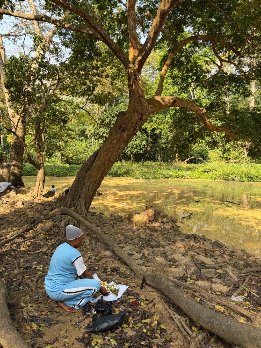 这个森林是奥孙女神的居所,她是掌管生育、河流、美丽、财富与治愈的女性orisha(神灵)。据当地神话记载,在16世纪,因饥荒而迁徙的王者Larooye Gbadewolu在河边安营时,奥孙女神从水中显现,禁止他们在此地砍伐、狩猎和捕鱼,作为交换,她许诺赐予繁荣与保护。于是人们在河边建起第一个宫殿(图1-3),后来还修建了第二个宫殿(图4-6),整片森林被划为禁区,专属女神,森林之外才是人们的居住地。从此,奥孙河成为连接人间与灵界的通道,森林则是灵界在人间的投影,这里每年八月要举办盛大的仪式,普通人平时也会来这里祈祷。图7-8就是一个女子为了自己的孩子,在向奥孙女神祈祷,祈祷完了把祭品往水里一扔,谁也别想吃。