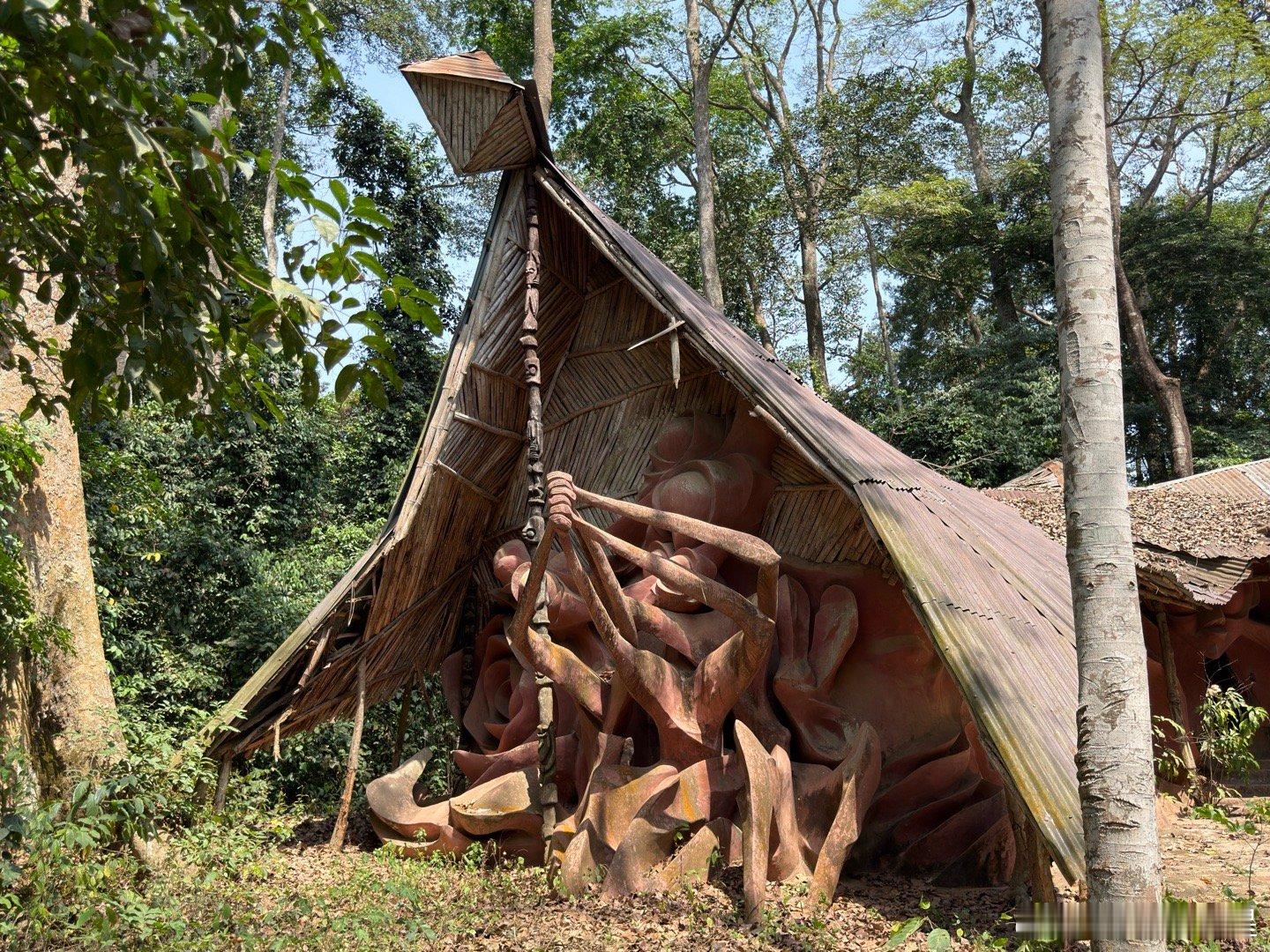 约鲁巴文明以前在很多城市都有圣树林,几百年宗教禁忌的禁猎、禁伐和禁耕造就了尼日利亚南部最后的原始湿润半常绿林残余,但不幸的是其他城市的圣树林都被毁了。由于殖民后的禁忌弱化和城市扩张导致的偷伐和垃圾倾倒,奥索博的圣森林在20世纪中叶也曾一度濒临毁灭,幸运的是,在1950年代,奥地利女艺术家Suzanne Wenger被本地祭司接纳,发起了“新神圣艺术运动”,她与当地的约鲁巴工匠合作,用水泥、铁、回收材料修复破损神龛、宫殿,并在森林中创作了40多座大型雕塑与建筑,如巨型拱门、鸟形神龛、蛇形桥、拟人化宫殿入口等,这些作品融合了古代神话与现代抽象艺术,形成的雕塑森林既保护了物质遗产,又复兴了精神传统。在艺术家的努力下,奥索博的圣树林被完整保留,很多珍稀动植物在这里得以继续繁衍,可谓是功德无量。