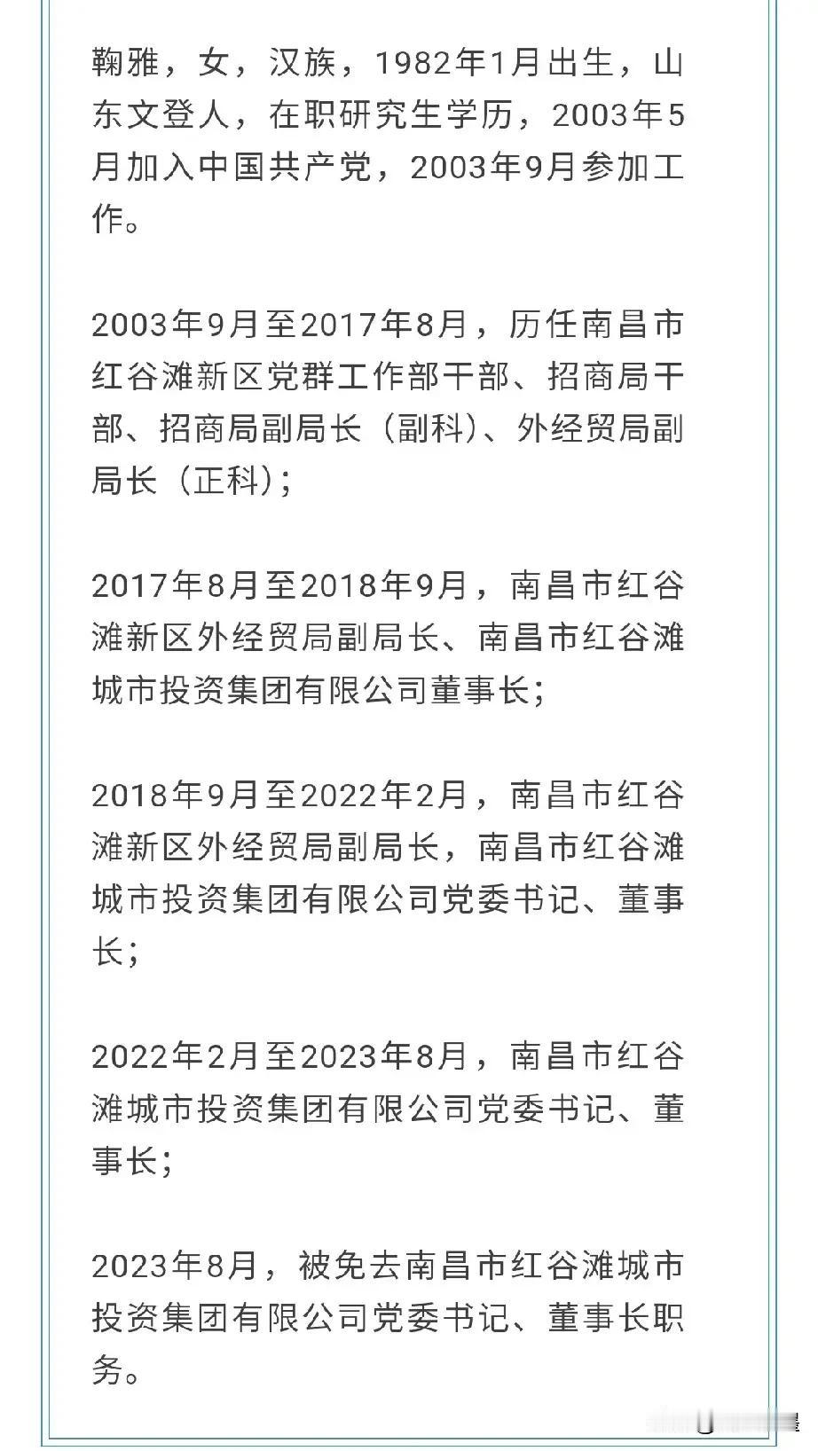 贪污4900万的鞠雅再次出现在大众视野内,现在的她已身陷囹圄,身穿囚服,面容略显憔悴,体型有些微胖,已经看不到往日那种神采奕奕的样子了! 鞠雅在镜头前哭着说对不起自己的母亲! 当她母亲看到这些话时,内心也五味杂陈吧,她怎么也不会想到自己曾经引以为傲的女儿,从小学习优秀,懂事听话,毕业后努力工作,辛勤付出,年纪轻轻便走上了领导岗位,如今却变成了这样,竟然成了一位大贪官,阶下囚! 鞠雅,1982年出生于山东威海文登市,她从小便聪明好学,长相出众,乖巧懂事,深得父母喜爱,家里人对她寄予厚望,希望她将来能够有所成就! 她不负重托,22岁从四川大学毕业后便通过选调进入了南昌市红谷滩新区工作,从此踏入了官场。 她的职业生涯非常顺利,晋升速度异于常人,26岁便晋升为副科级干部,后又担任过当地外经贸局副局长。 转折点发生在其35岁那一年,她被提拔为红谷滩城投董事长,从此她手中的权利变大了,曾经的初心也在悄然发生改变! 她开始利用手中职权干预项目招标,接受别人宴请,收受别人钱物,最大的一笔笔收了别人950万。 慢慢的又从要别人的开始向别人伸手要,甚至明码标价的要,最终受贿数额高达4900万! 做这些时,她忘记了初心,忘了自己曾被评为“省优秀三八红旗手”,忘记了母亲从小对她的谆谆教诲! 经过强烈的思想斗争后,她选择主动向组织交代问题,那年她才41岁,正值干事创业的大好时期,可惜了!