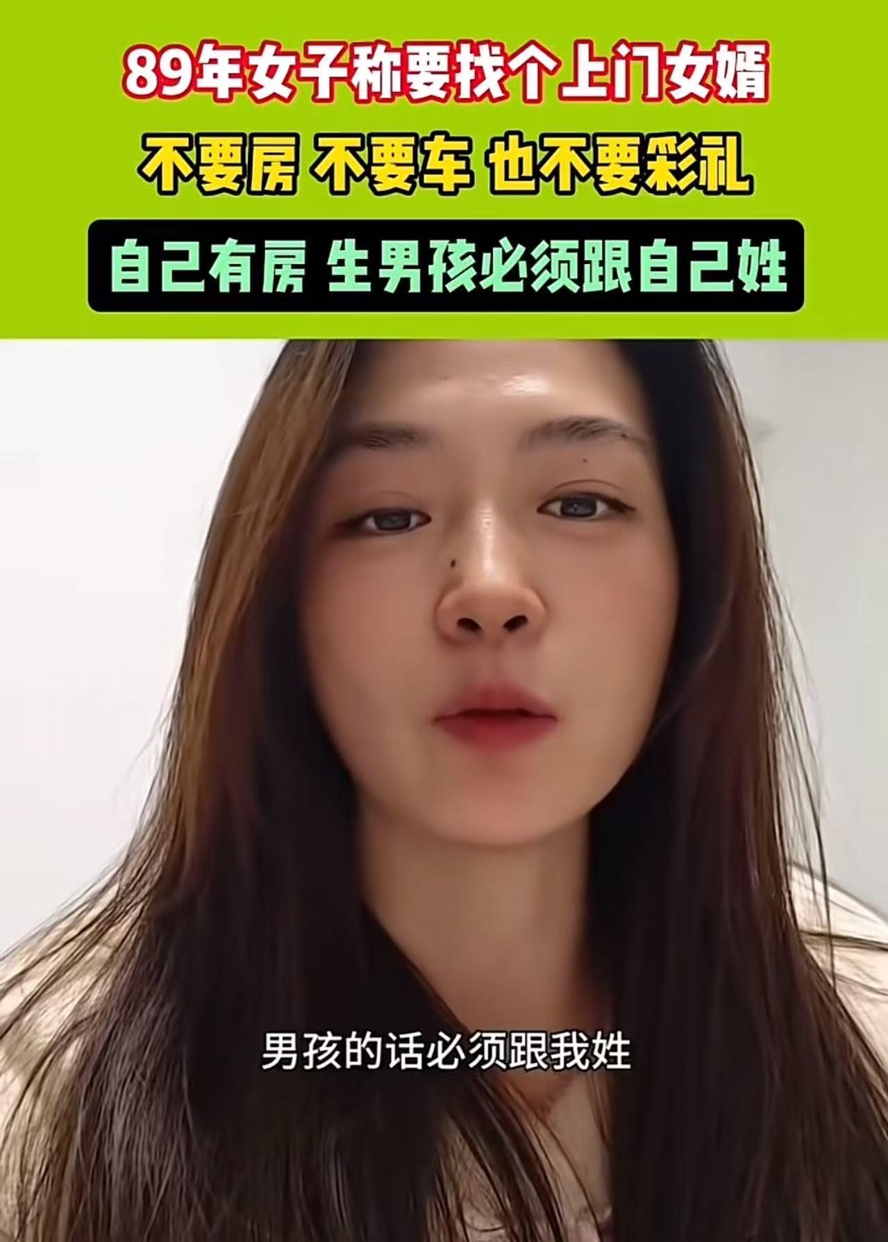 89年女子称要找个上门女婿,不要车不要房 也不要彩礼,但是生男孩必须跟自己姓!网友: 一位1989年出生的女子,在社交平台发布了自己的征婚条件,迅速冲上热搜。 她直言:“我今年37岁了,想找一个愿意做上门女婿的人,不图你有钱,但有五个条件必须满足。” 这位女士身高1米72,气质干练,事业稳定,在老家县城有一份体面的工作,父母健在,家庭和睦。如今年纪渐长,她决定不再将就,但也愿意为婚姻做出务实安排。 她的五个条件如下: 1. 年龄适配:希望对方年龄在27到47岁之间。“我都快40了,总不能找个60岁的吧?加起来快100岁了,那不是找老伴,是找‘病友’。”她半开玩笑地说。 2. 身高匹配:她本人1米72,希望男方至少1米70以上,“站在一起别让我穿平底鞋都比他高,那样拍照太尴尬。” 3. 孩子随母姓(仅限男孩):这是她最坚持的一条——“如果生的是男孩,必须跟我姓。女孩可以随你姓,也可以协商。但我家三代单传,到我这儿断了香火,我不想让父母一辈子遗憾。” 4. 共建新房,产权归你:她提出两人一起在老家建一套自建房,所有手续、房产证都写男方名字。“我不图你的房,反而愿意出钱出力一起盖,但希望有个属于我们小家庭的窝。” 5. 年内结婚:希望今年年底前能定下来,步入婚姻。“感情可以慢慢培养,但年龄不等人,我不想再拖了。” 特别值得一提的是,她明确表示:不要彩礼、不要三金五金、不要车、不要现成的房子。“我不是卖女儿,也不是靠男人养。我有工作、有存款、有父母支持,只缺一个愿意平等携手、尊重我家传统的伴侣。” 消息一出,评论区瞬间炸锅。 【网友热议】 支持!人家出钱出力还放弃彩礼,只要孩子随母姓,这条件简直太良心了好吗?多少男的白得一套房还挑三拣四? 男孩必须跟母姓?这有点难接受。姓氏是家族传承,女方可以理解,但完全不让步是不是太强硬? 重点不是姓什么,而是她愿意共同建房、放弃彩礼、主动承担——现在多少男生结婚还要女方陪嫁车房?对比之下,这位女士太实在了! 为什么女孩随父姓天经地义,男孩随母姓就成了“大逆不道”?姓氏本就是符号,关键看双方是否真正平等协商。 【评语】 当一个女性主动放弃彩礼、房产、物质索取,只求在姓氏上传承家族血脉时,社会却用“霸道”“不讲理”来指责她——这暴露的不是她的苛刻,而是根深蒂固的父权惯性。 真正的婚姻平等,不是嘴上说“男女一样”,而是在涉及家族、姓氏、财产这些核心利益时,能否真正尊重女性的选择权。 她不要车房彩礼,要的只是一个被看见、被尊重的身份延续。如果连这点都不能接受,那所谓的“上门女婿”,不过是换了个名头的传统依附罢了。 在这个动辄谈“彩礼几十万”“无房不嫁”的婚恋市场里,她的坦诚与担当,反而成了一面照妖镜——照出了多少人打着“传统”旗号,行着自私之实。