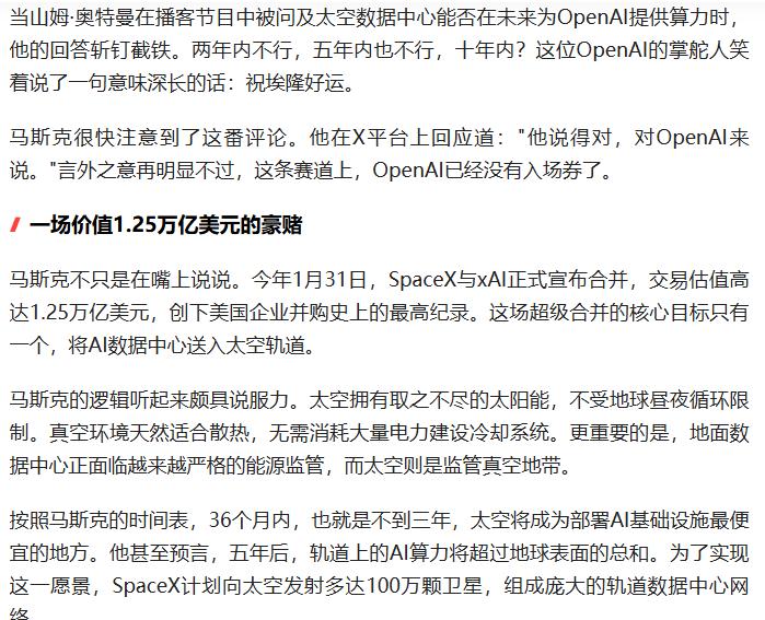 奥特曼对未来的认知能力不足啊。 中美现在差距有多大,未来会有多大,看看这个对比就知道了。 当美国资本家还在打嘴炮的时候,中国已经领跑太远了。 至于太空计算最终能不能真的为人工智能提供源源不断的的算力支持,在做的过程中去完成去得到验证。 这就是知行合一。 这就是一个国家有足够长历史的好处,前人智慧的积累会有助于我们看清事物不变的本质。 马斯克对未来的看法未必一定正确,但他这句话一定是没有错的。 不管以后太空计算发展的结束如何,但 这里已经没有Open AI 的位置了。 点右上角关注我,我们一起去看这个魔幻的世界