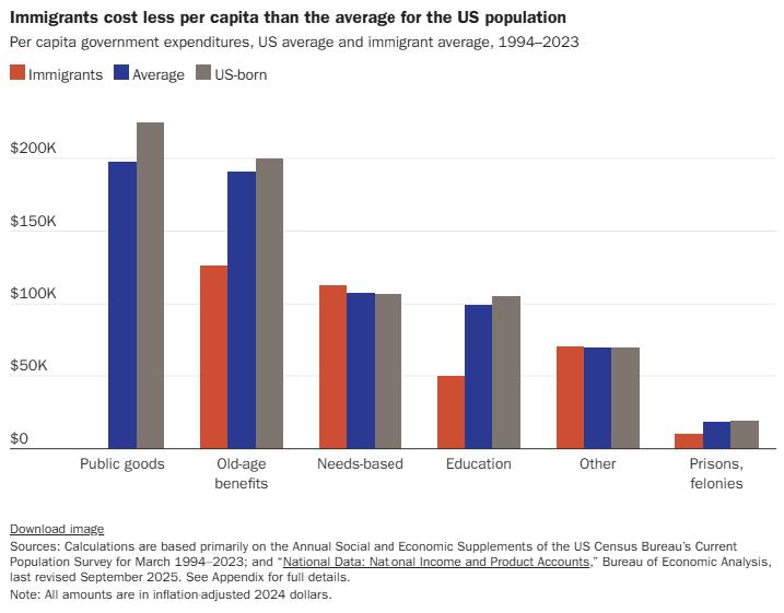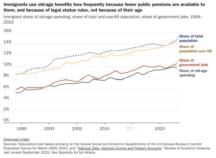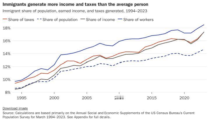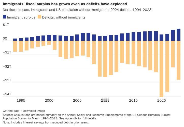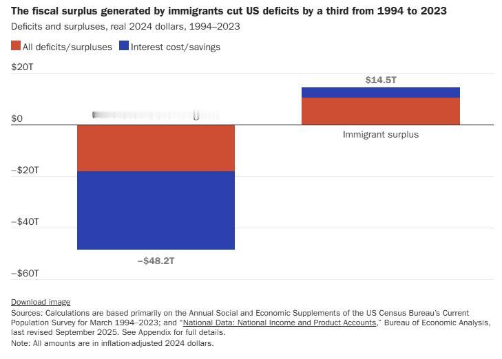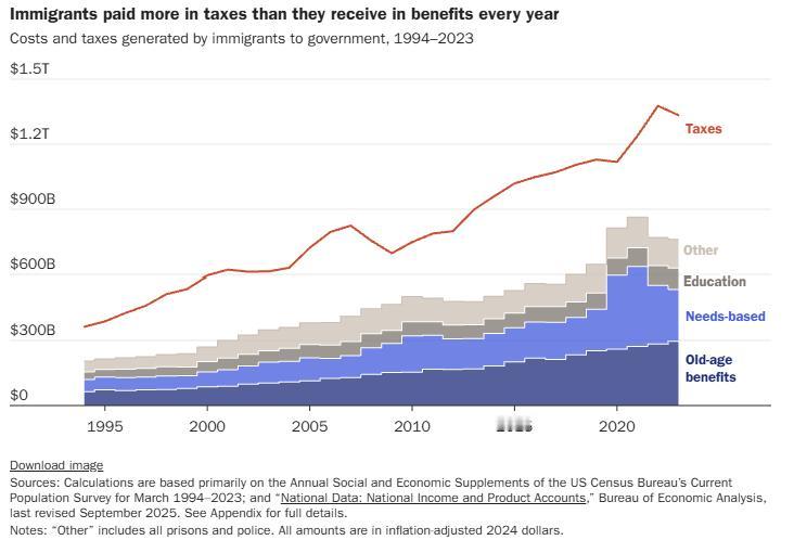 移民对美国的贡献往往容易被低估。美国卡托研究所最近新出的一份研究报告显示:自1994年以来,移民使美国财政赤字减少了14.5万亿美元。自1994年开始收集数据以来,每年移民缴纳的税款都高于他们从联邦、州和地方政府获得的福利。这些财政收益持续增长,并在2023年(也就是研究里最后一年的数据)达到历史最高水平。 图片来源于网络